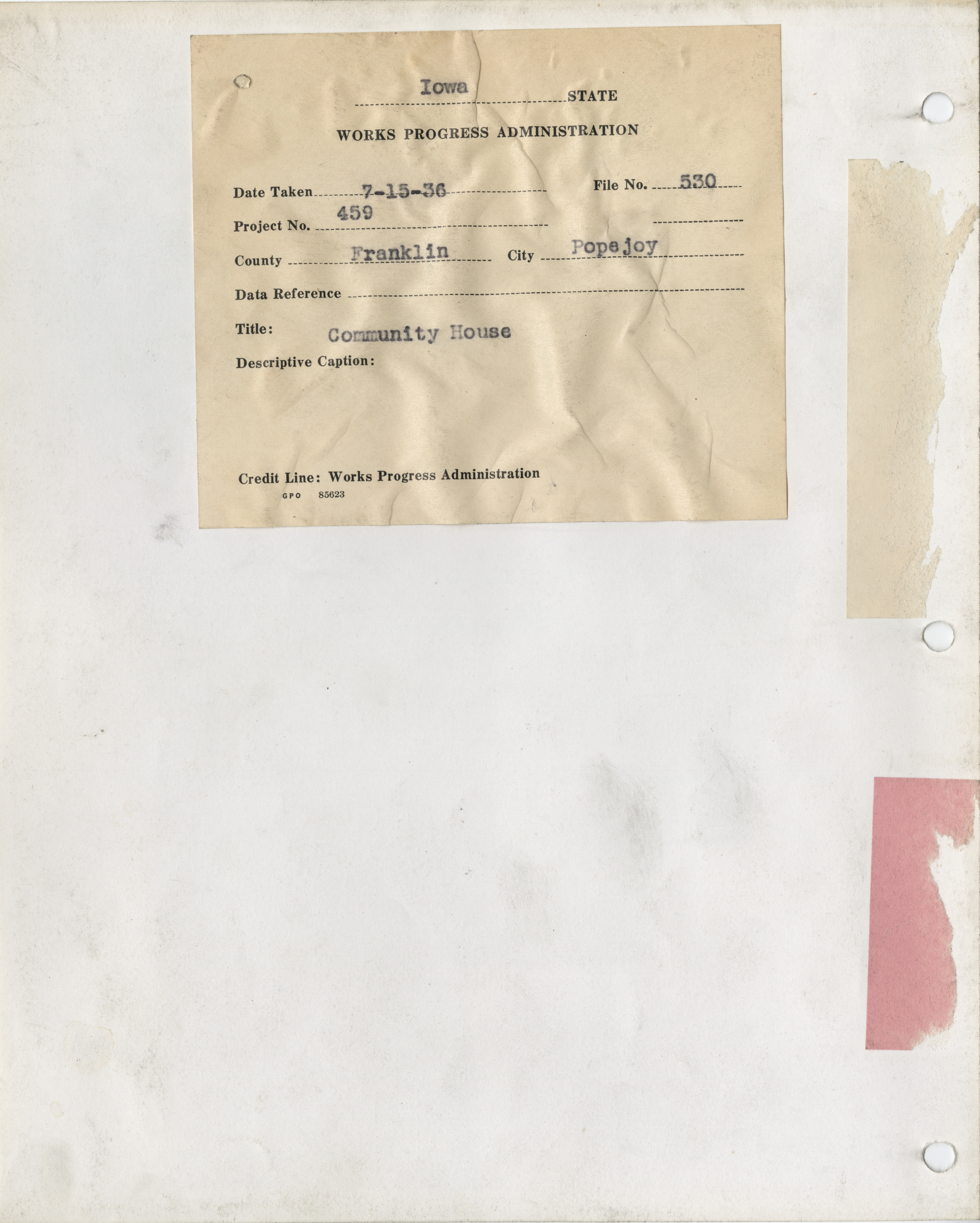- Public Buildings. Franklin County. Popejoy. Community House. Project 459. (1 b/w photograph), 1939