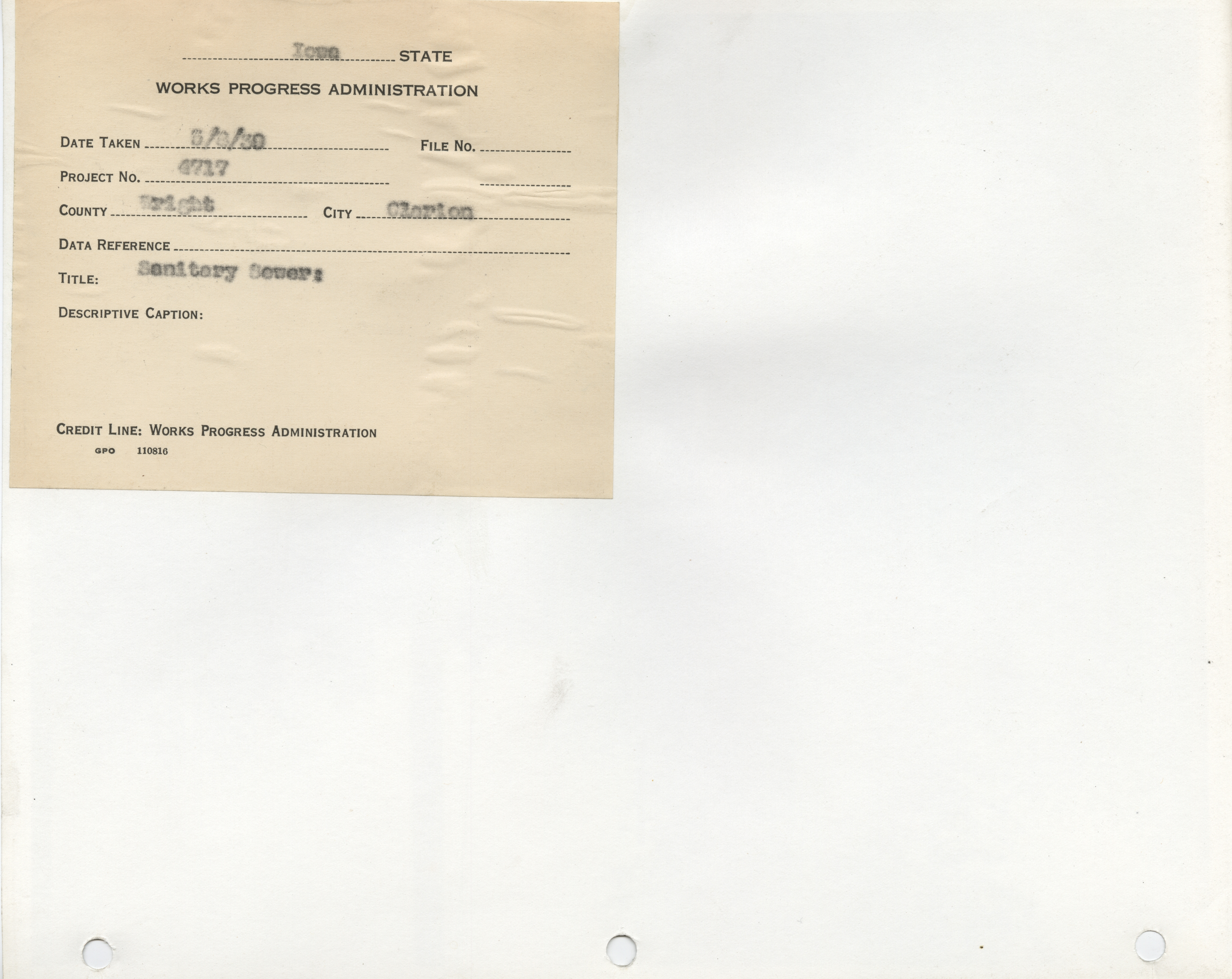 - Sanitation and Water Supply. Wright County. Clarion. Sewer. Project 4717. (2 b/w photographs), 1939
