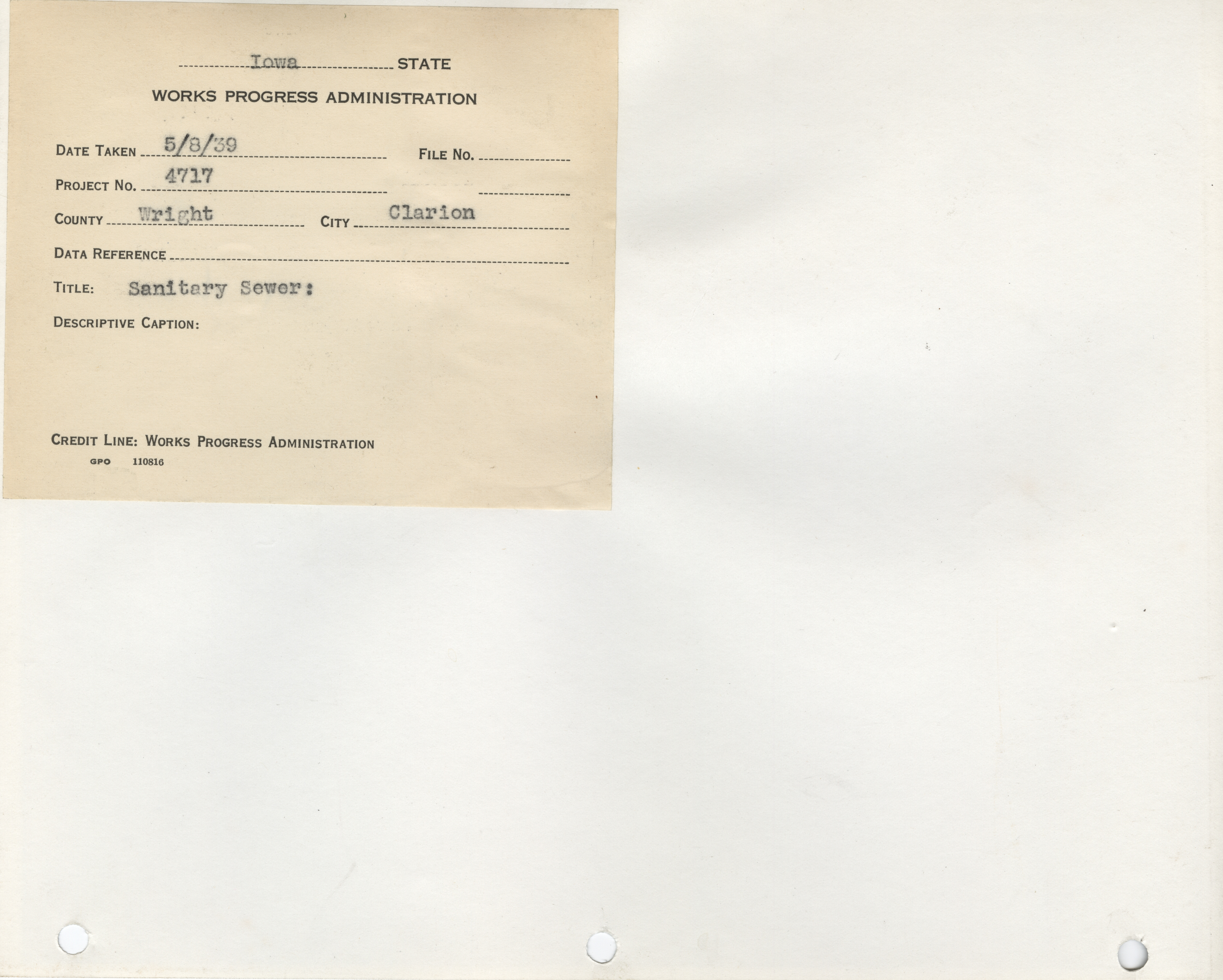 - Sanitation and Water Supply. Wright County. Clarion. Sewer. Project 4717. (2 b/w photographs), 1939