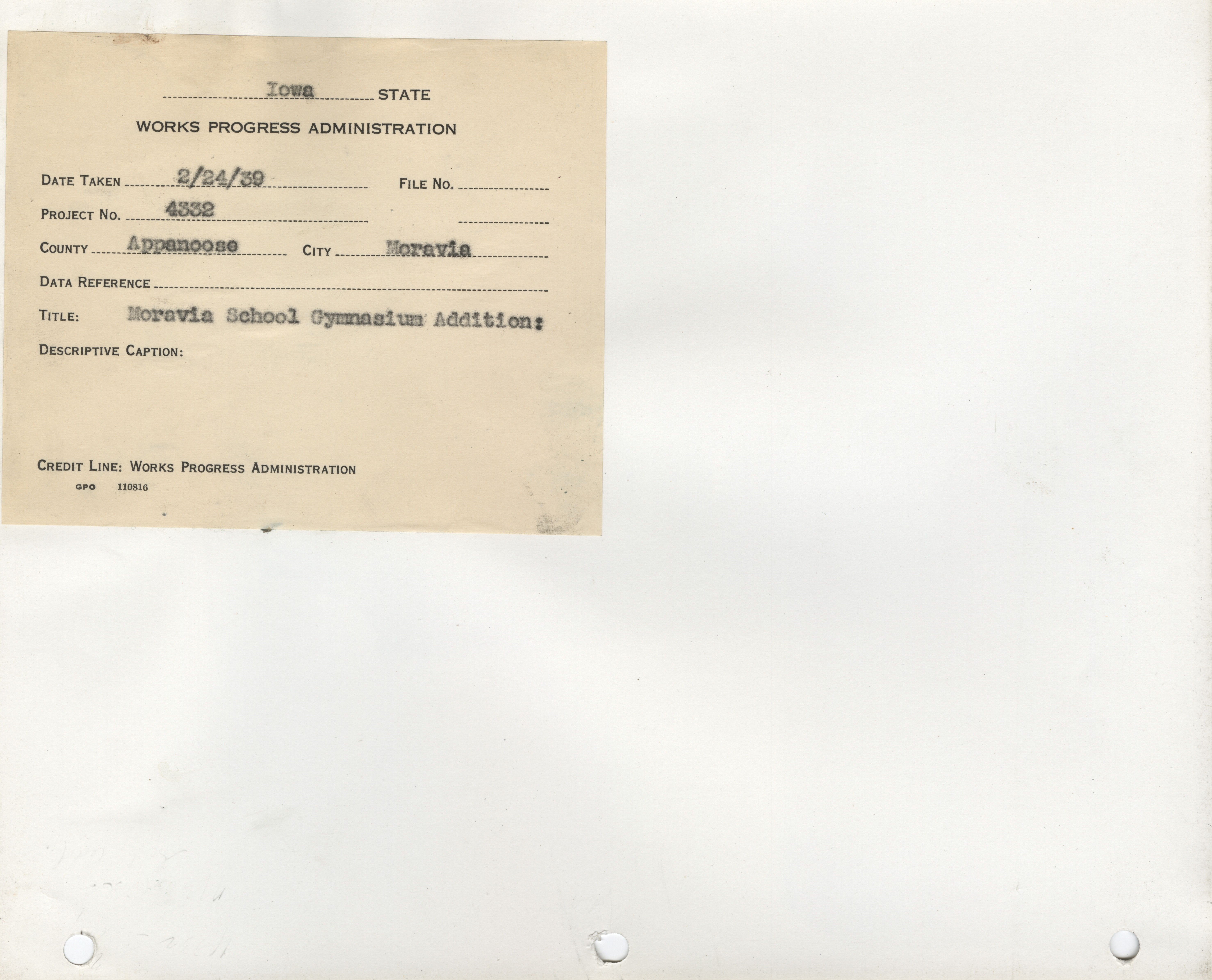 - School Buildings. Appanoose County. Moravia. School Gym Addition. Project 4332. (1 b/w photograph), 1939