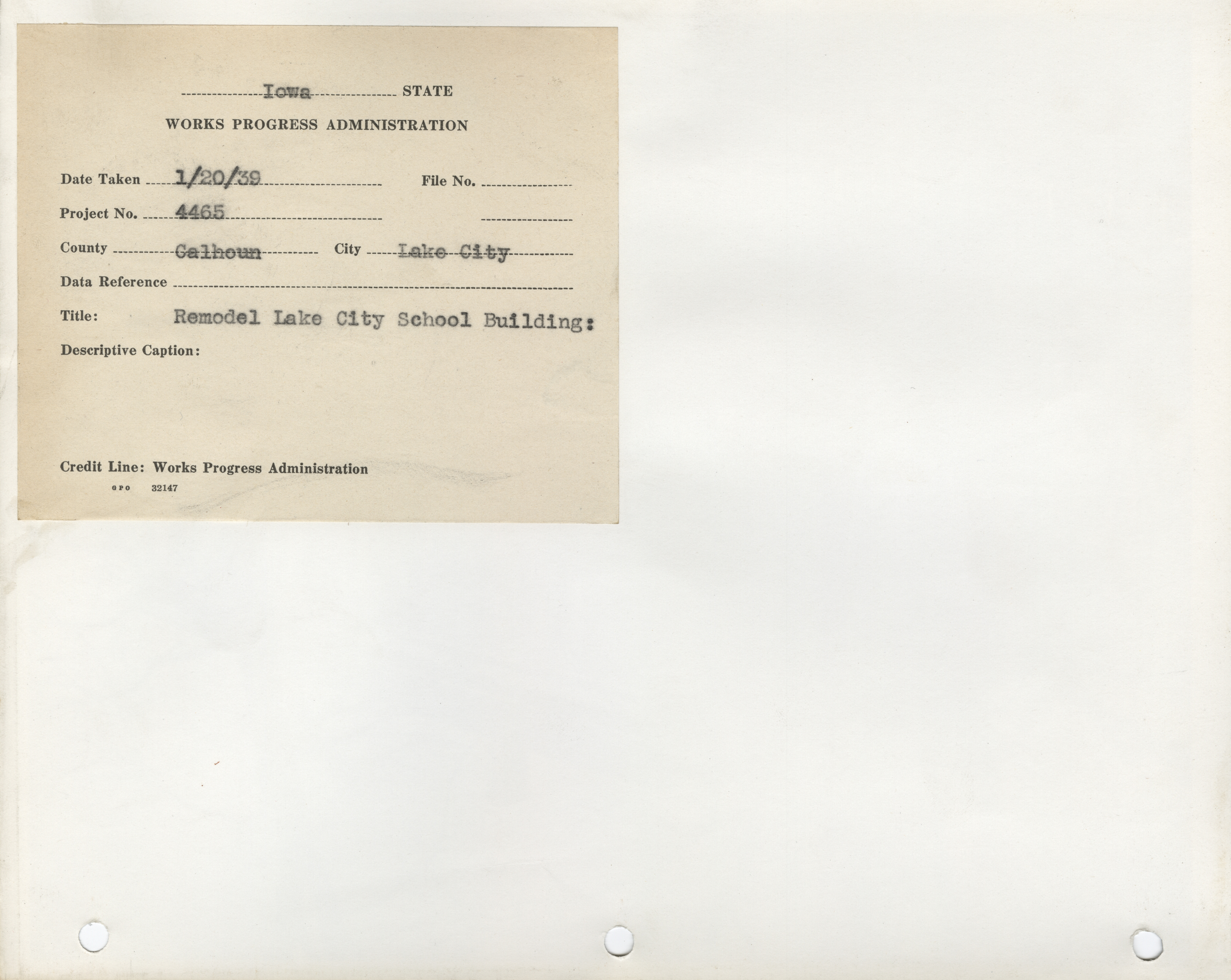 - "Photograph of a school building remodel in Lake City", Work Projects Administration (Iowa) Photographs, Iowa State University Library Digital Collections