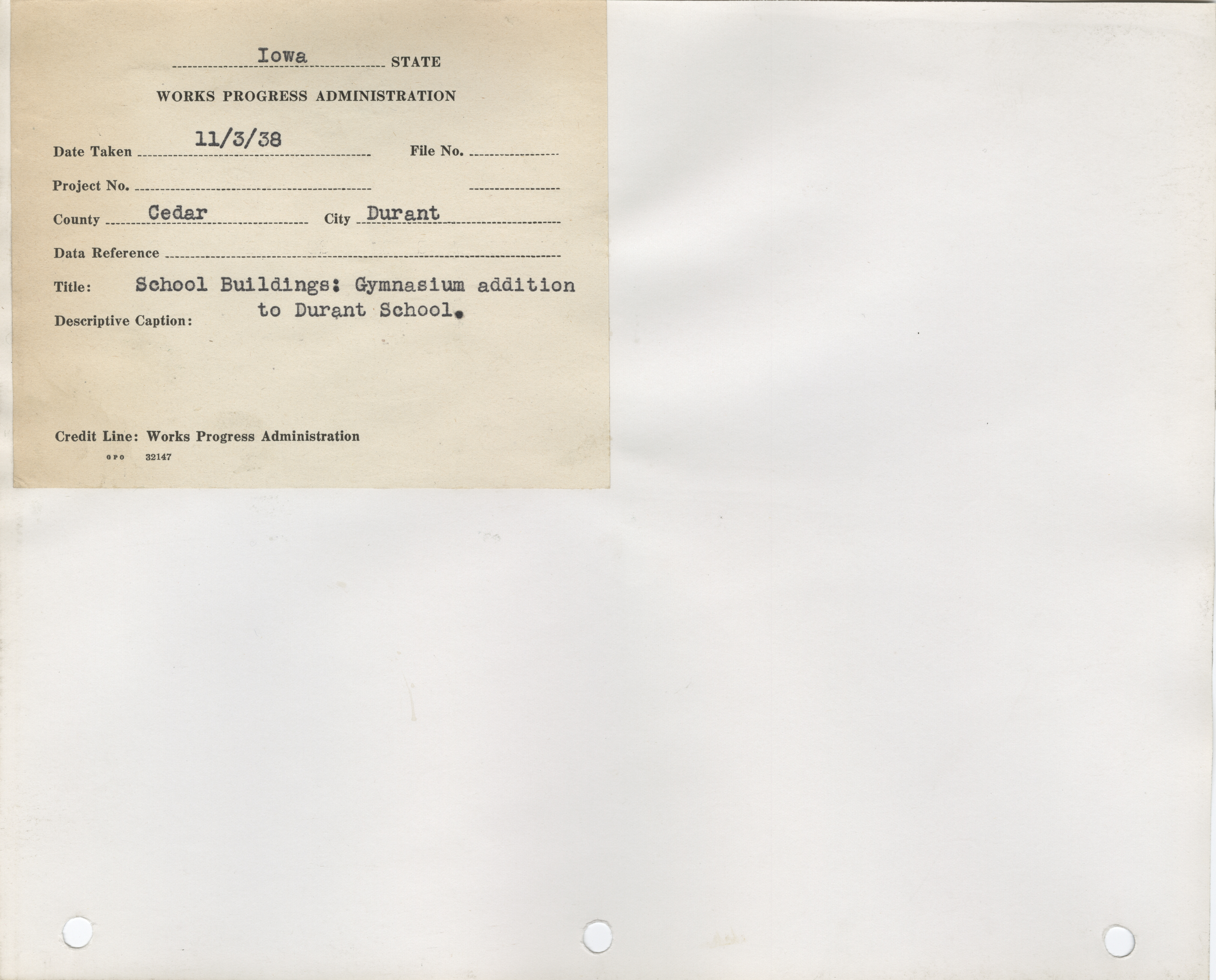 - "Photograph of a school building gymnasium addition in Durant", Work Projects Administration (Iowa) Photographs, Iowa State University Library Digital Collections