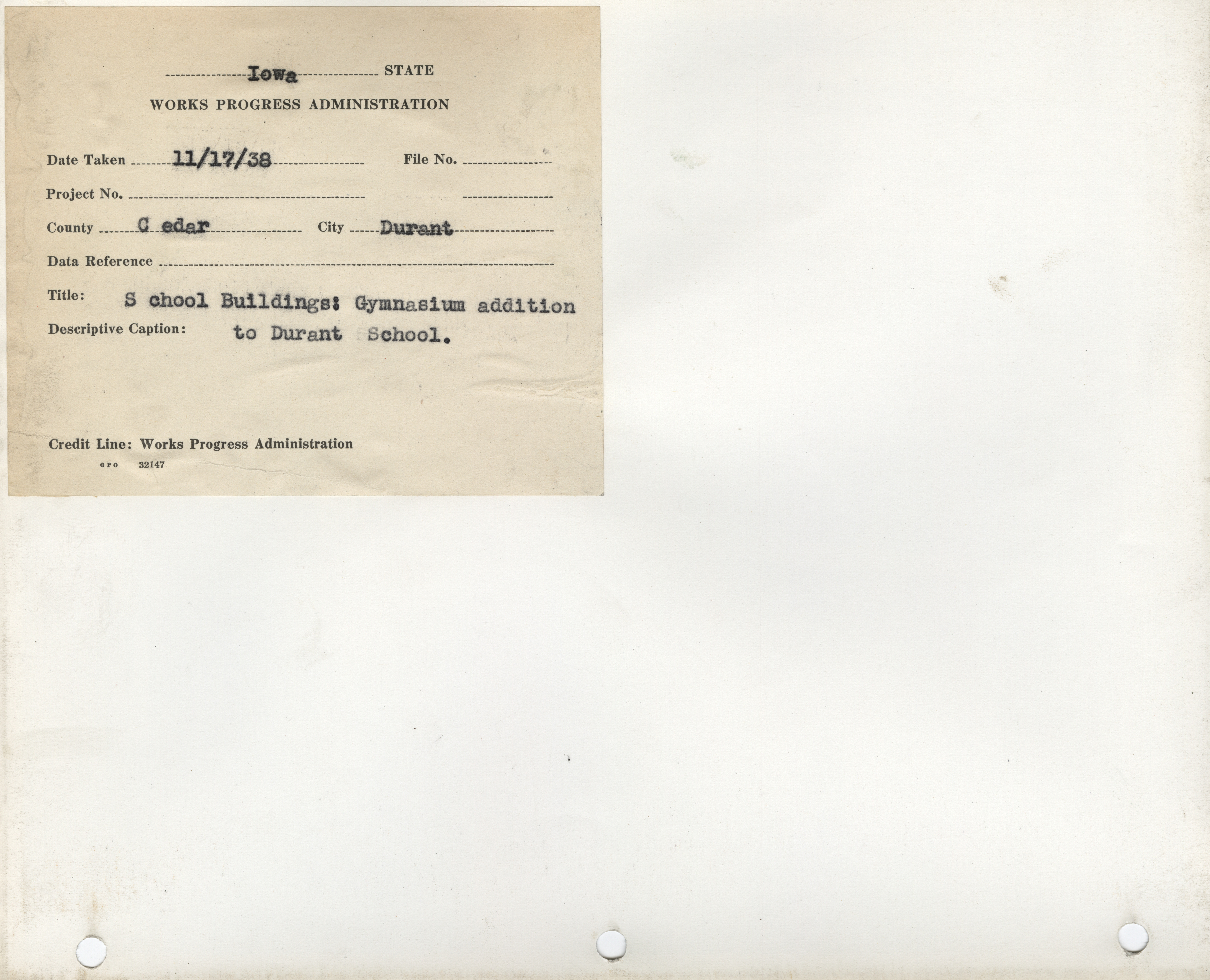 - "Photograph of people working on a school building gymnasium addition in Durant", Work Projects Administration (Iowa) Photographs, Iowa State University Library Digital Collections