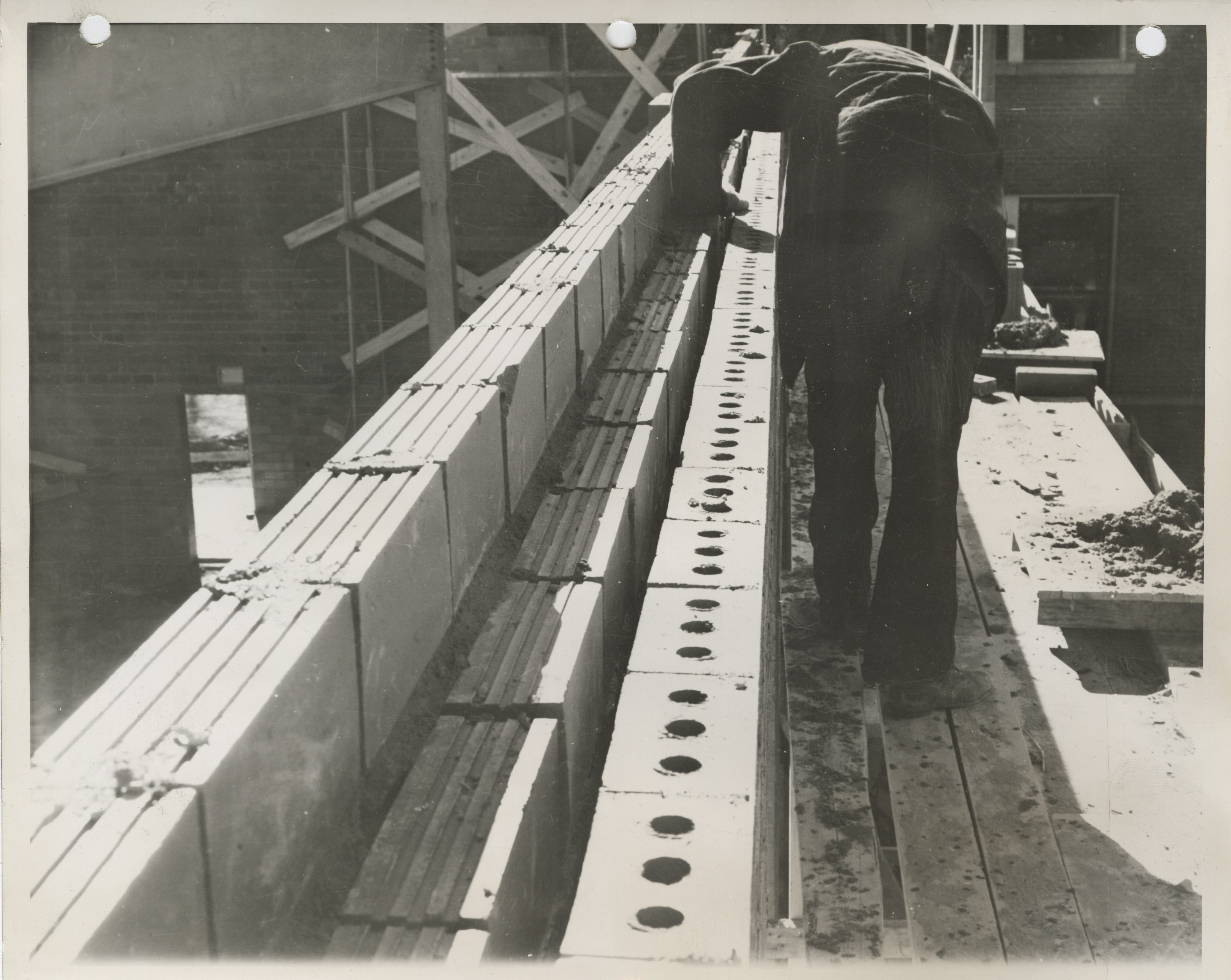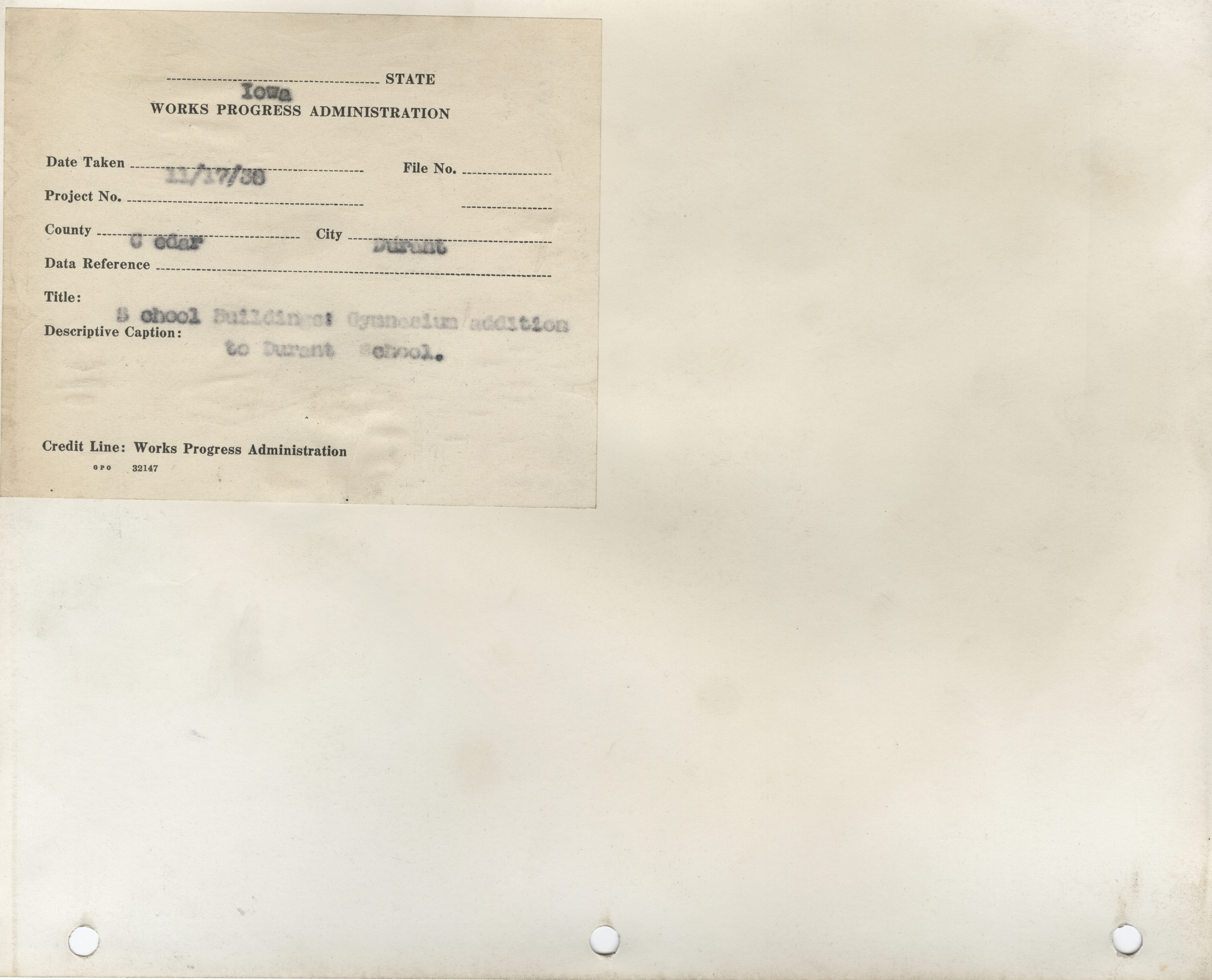 - "Photograph of a person working on a school building gymnasium addition in Durant", Work Projects Administration (Iowa) Photographs, Iowa State University Library Digital Collections