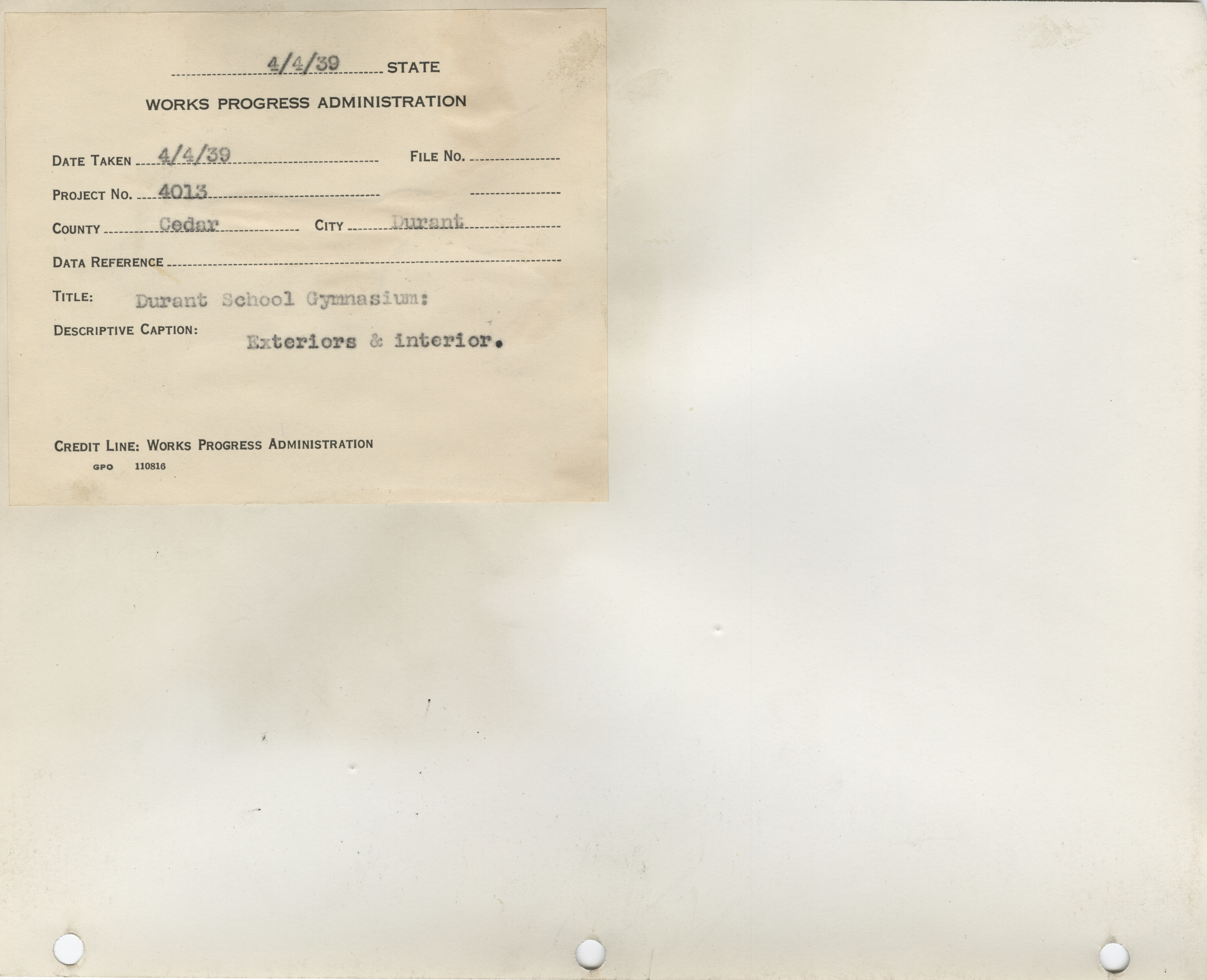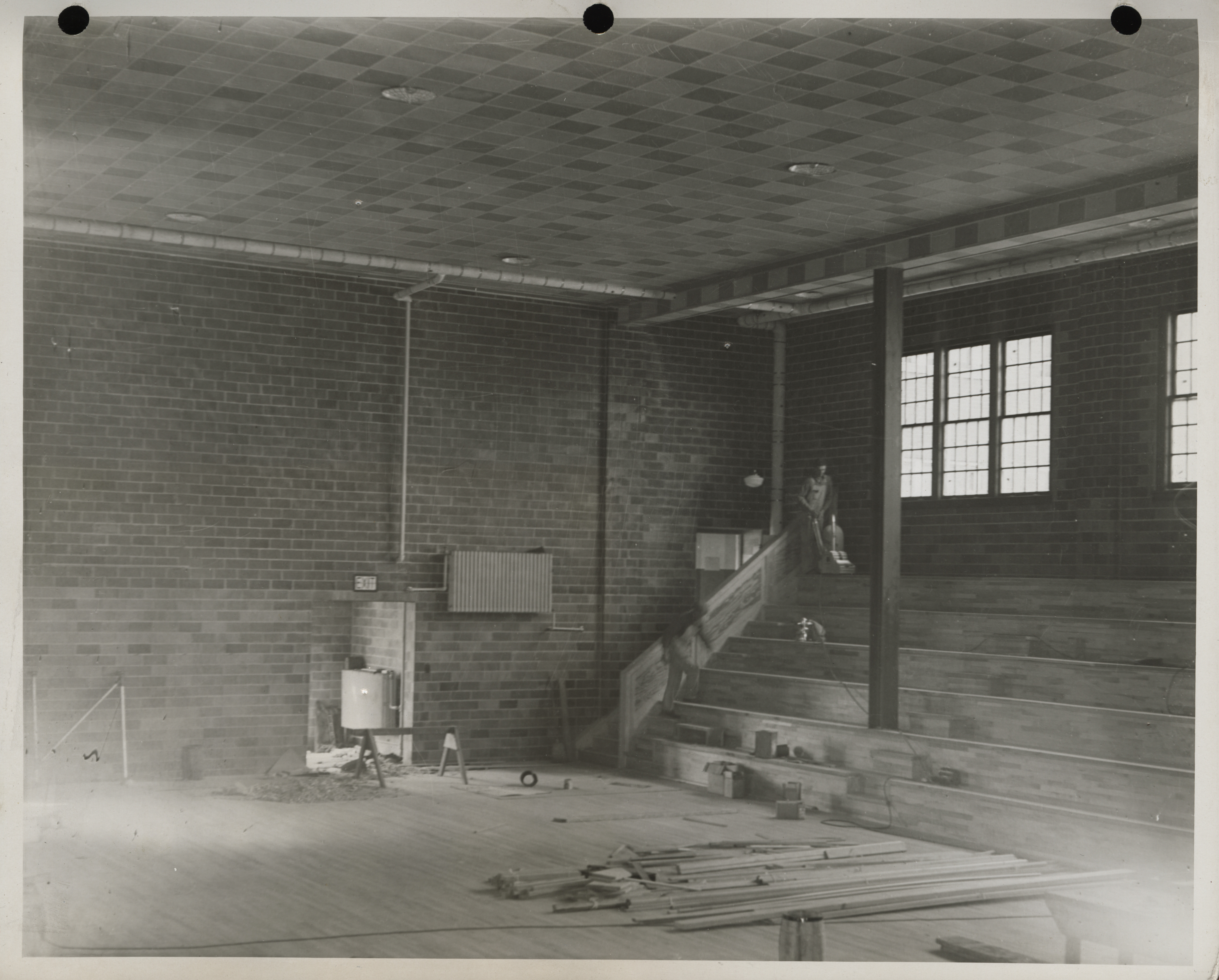 - School Buildings. Cedar County. Durant. School Gym. Project 4013. (8 b/w photographs), 1938-1939