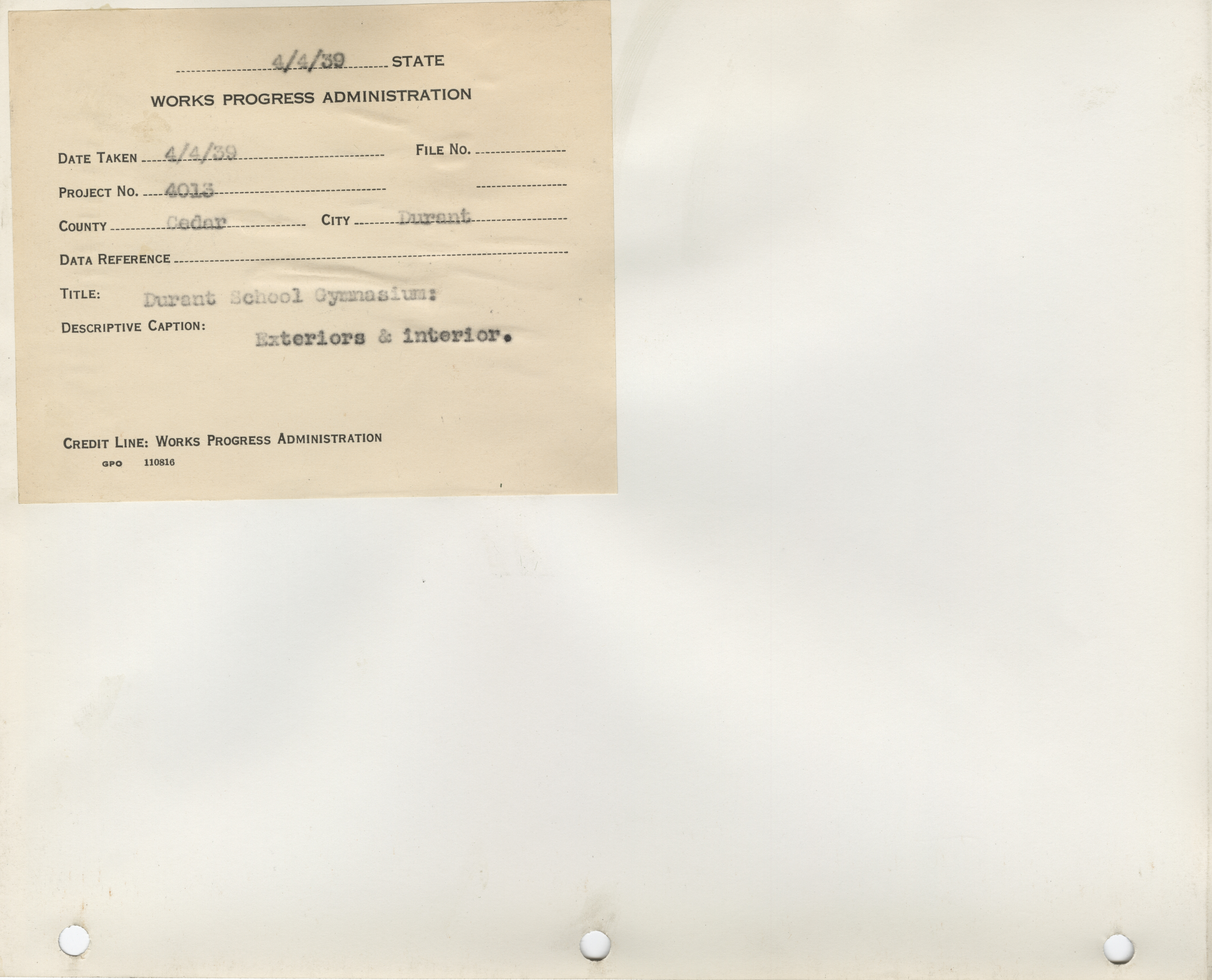 - School Buildings. Cedar County. Durant. School Gym. Project 4013. (8 b/w photographs), 1938-1939