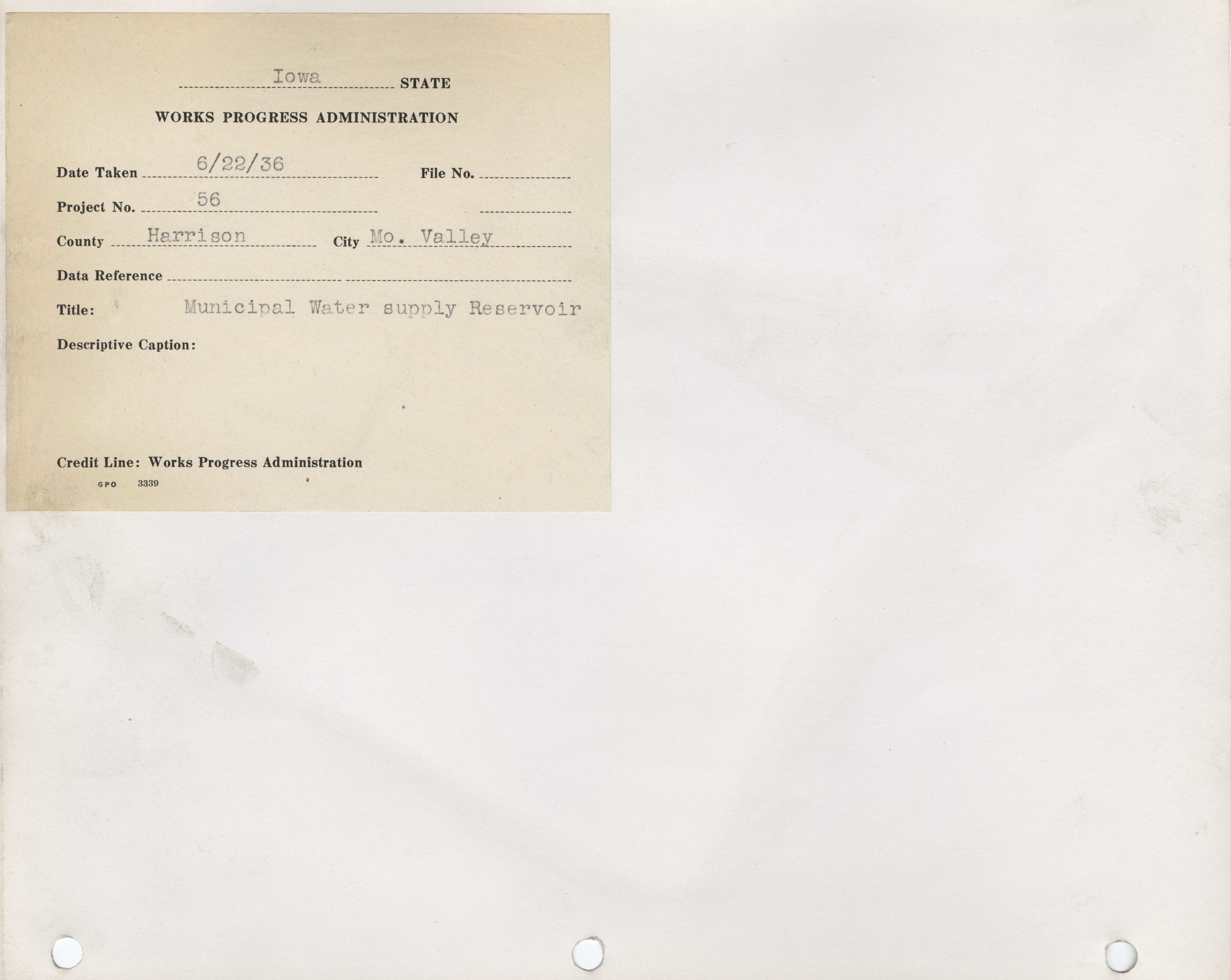 - Sanitation and Water Supply. Harrison County. Missouri Valley. Municipal Water Supply Reservoir. Project 56. (1 b/w photograph), 1936