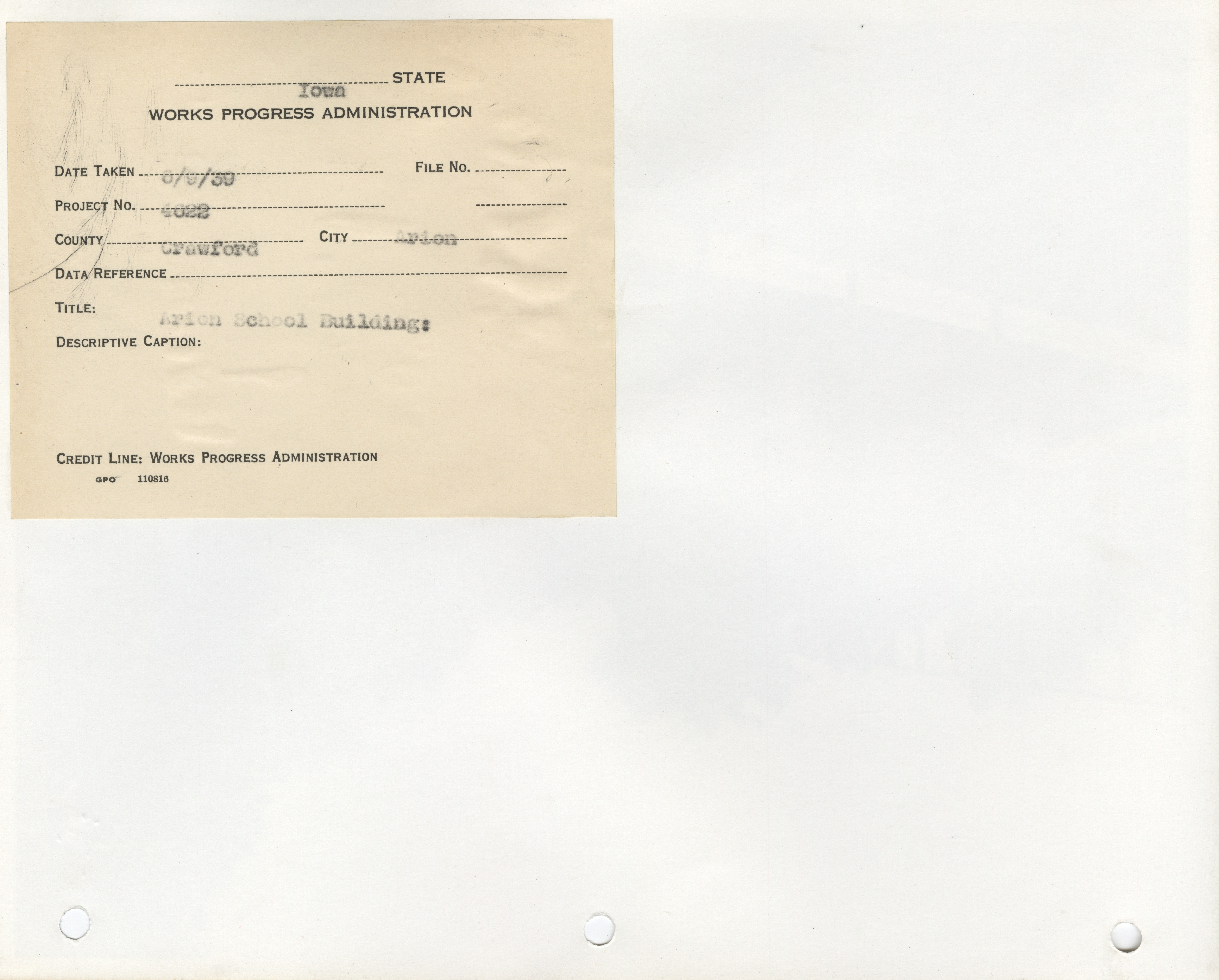 - School Buildings. Crawford County. Arion. Building School. Project 4022. (1 b/w photograph), 1939