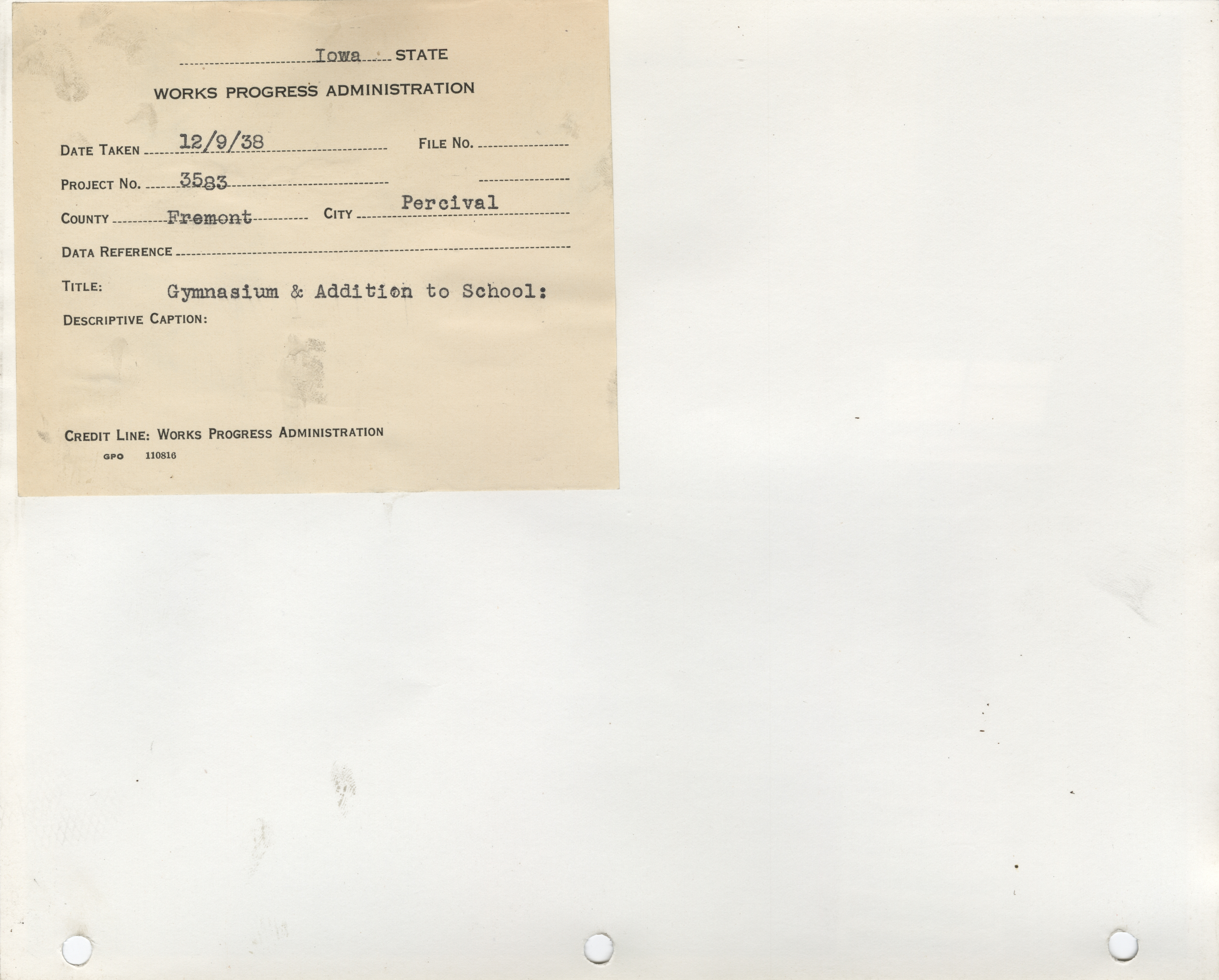 - School Buildings. Fremont County. Percival. Gym and School Addition. Project 3583. (3 b/w photographs), 1938