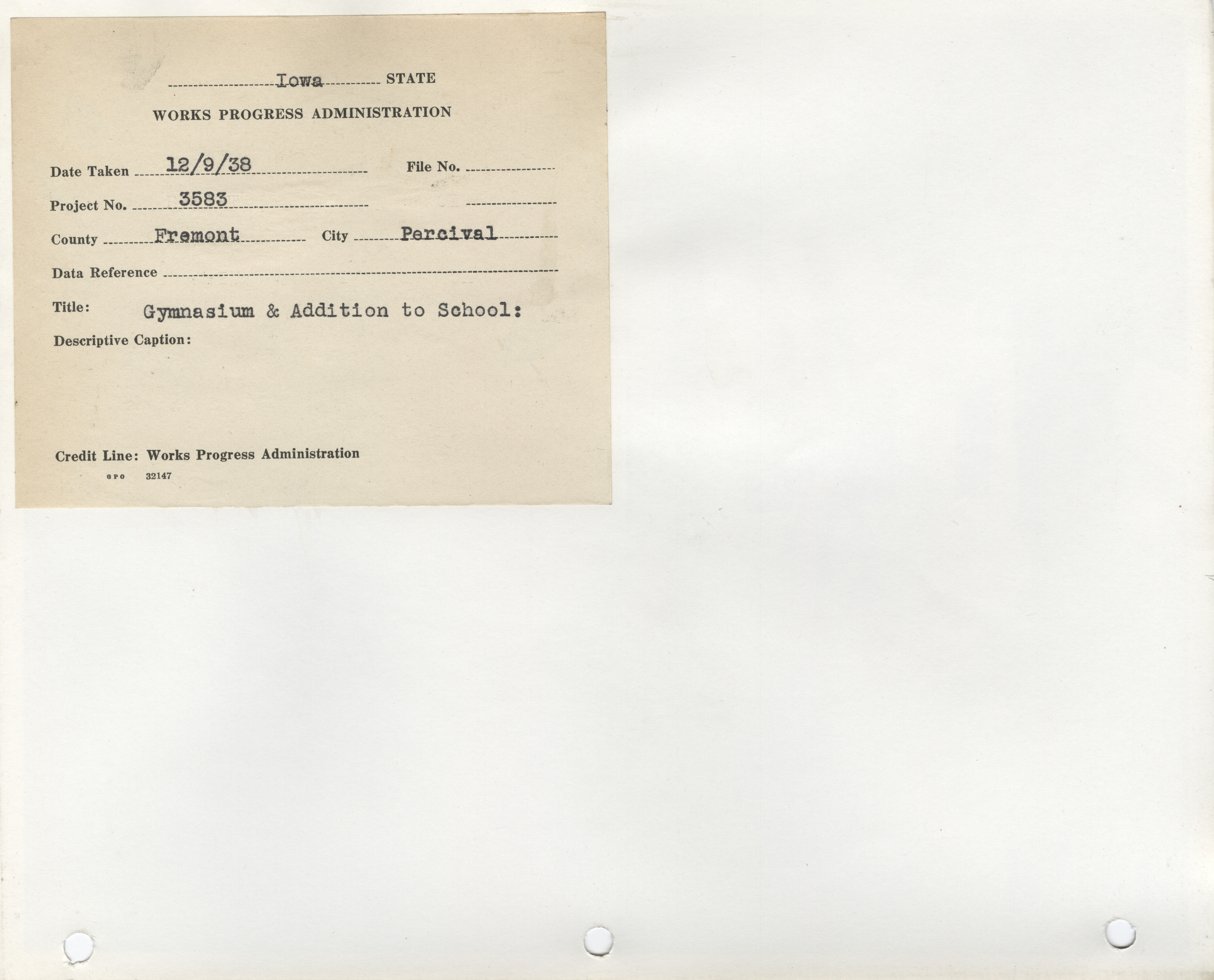 - School Buildings. Fremont County. Percival. Gym and School Addition. Project 3583. (3 b/w photographs), 1938