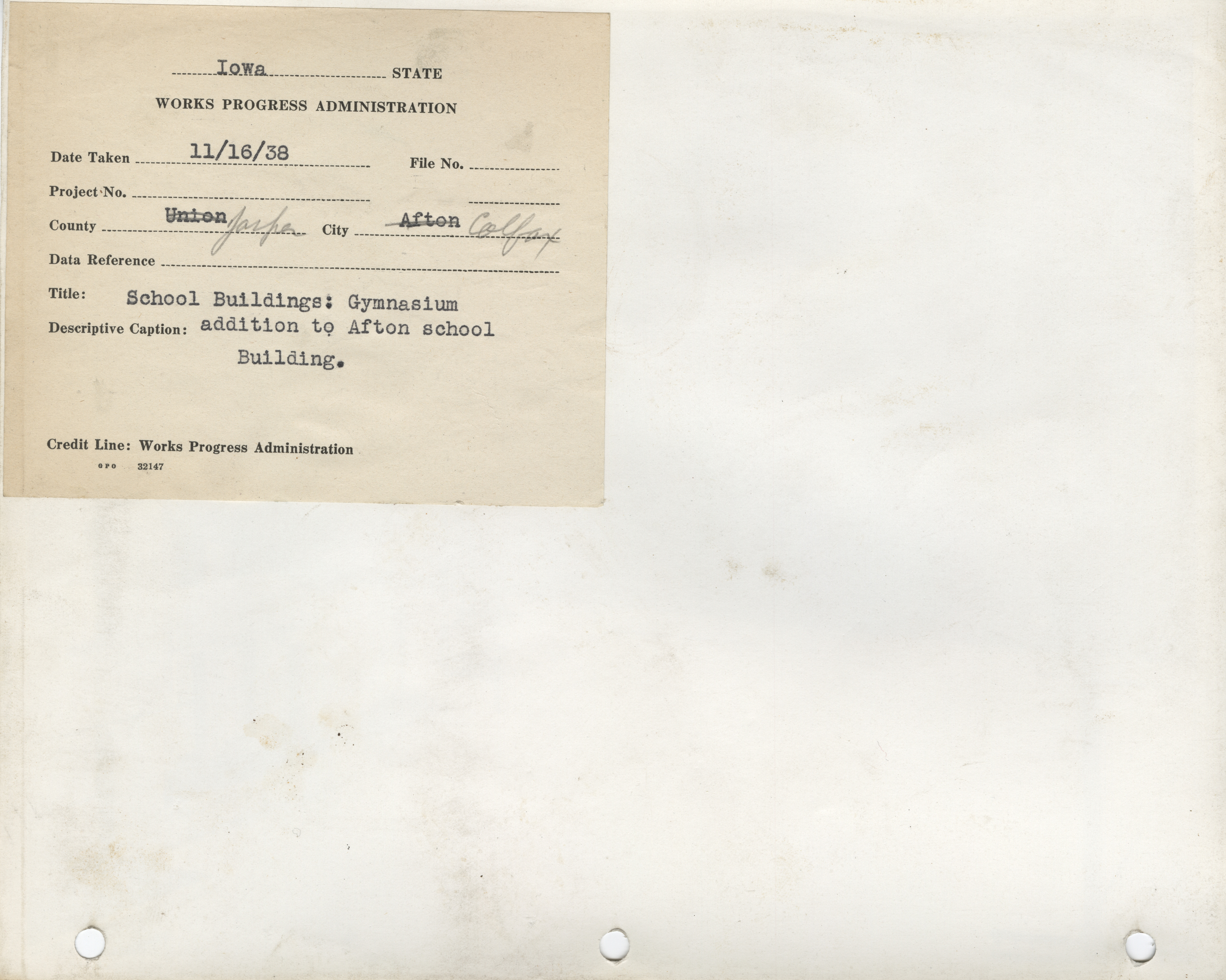 - "Photograph of a school building gymnasium addition in Colfax", Work Projects Administration (Iowa) Photographs, Iowa State University Library Digital Collections