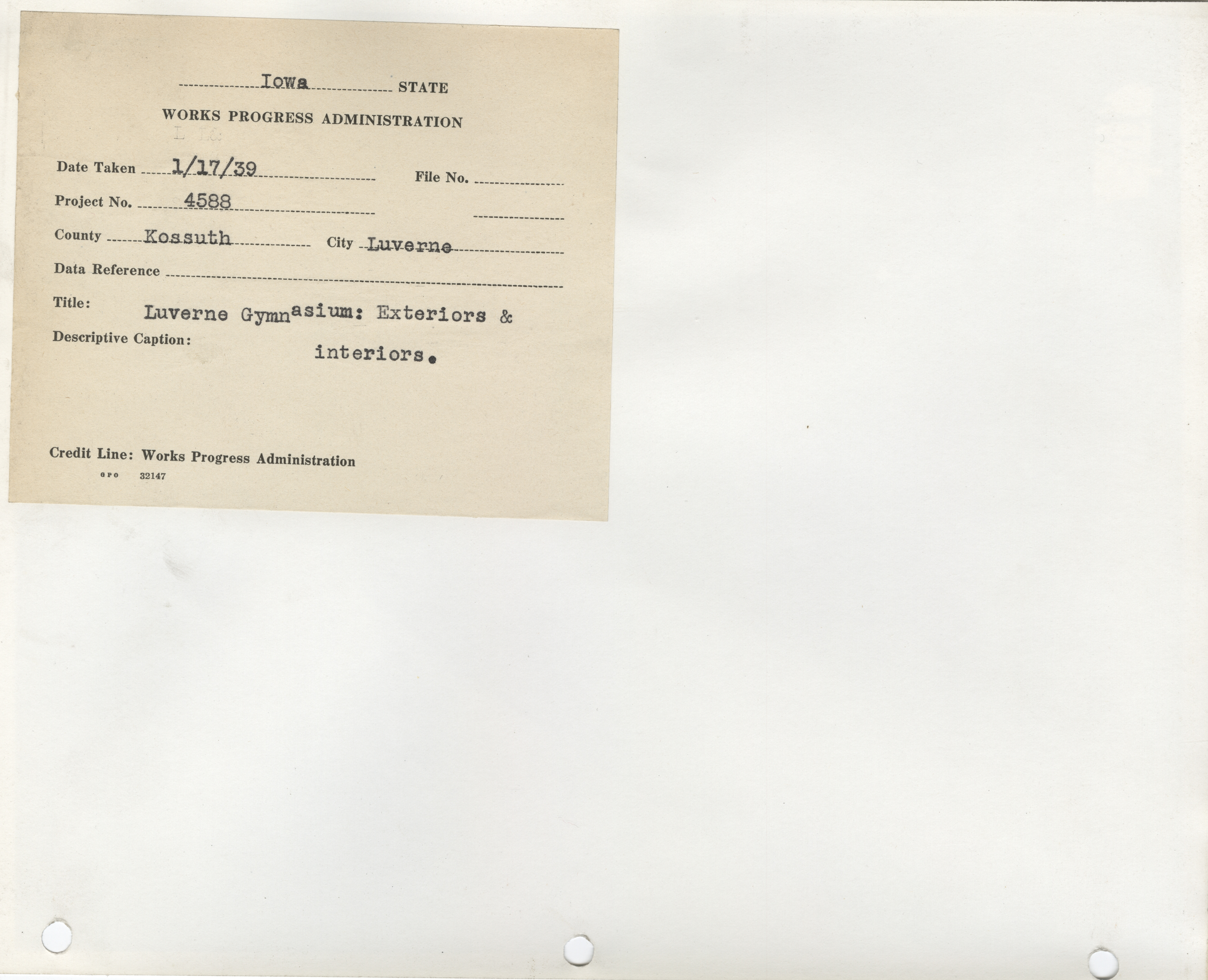 - School Buildings. Kossuth County. Luverne. School Gym. Project 4588. (6 b/w photographs), 1939