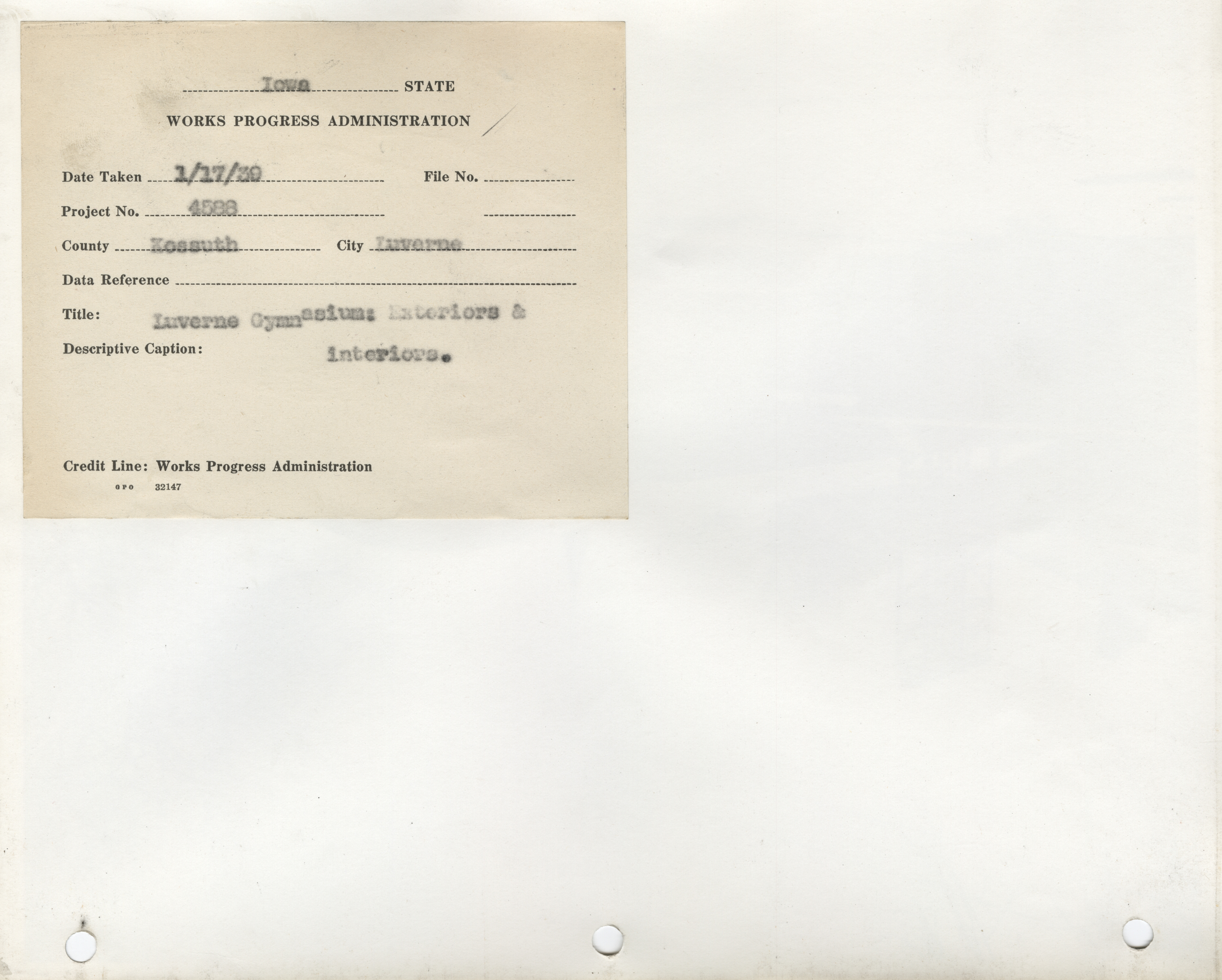 - School Buildings. Kossuth County. Luverne. School Gym. Project 4588. (6 b/w photographs), 1939