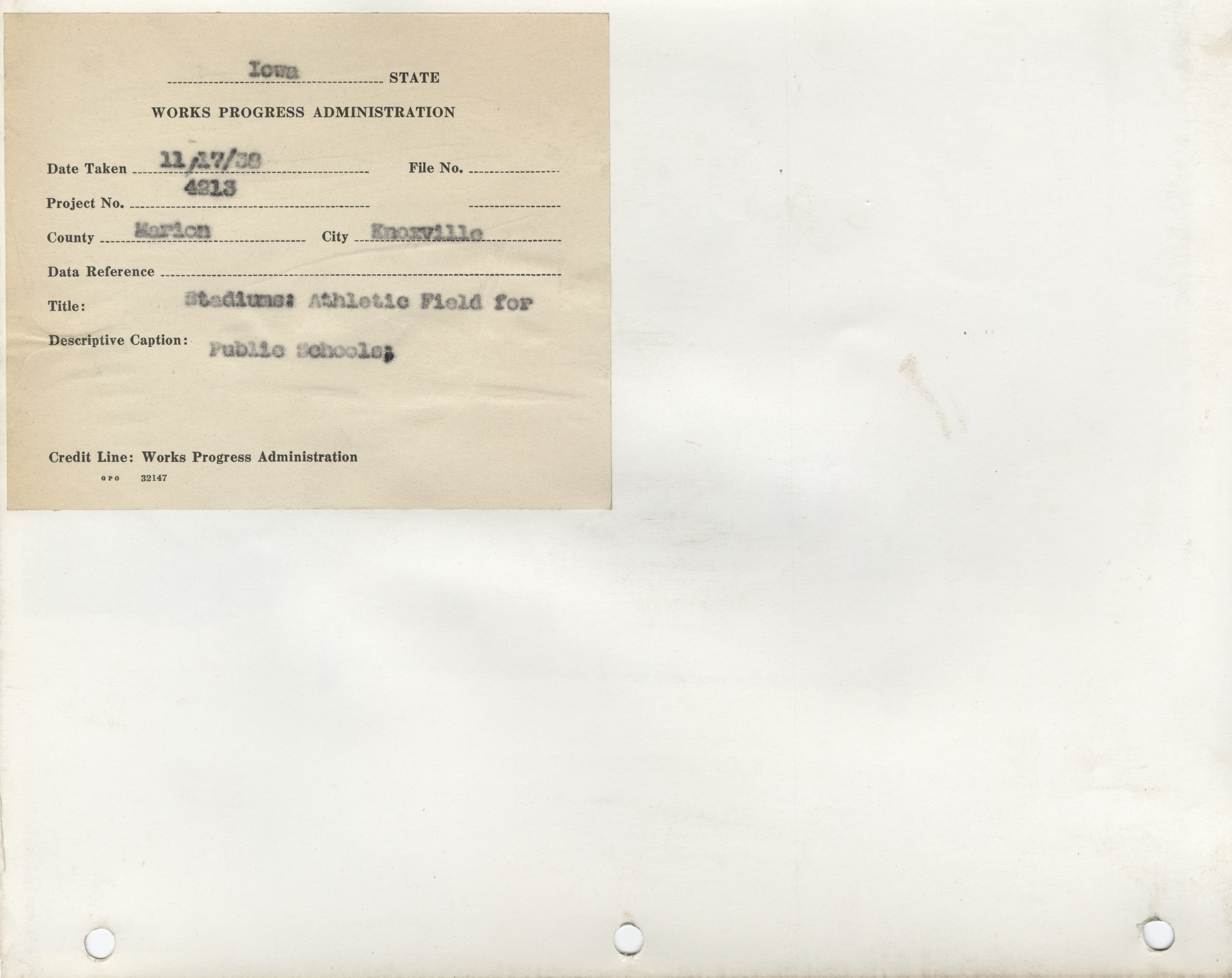 - "Photograph of construction of a school stadium and athletic field in Knoxville", Work Projects Administration (Iowa) Photographs, Iowa State University Library Digital Collections