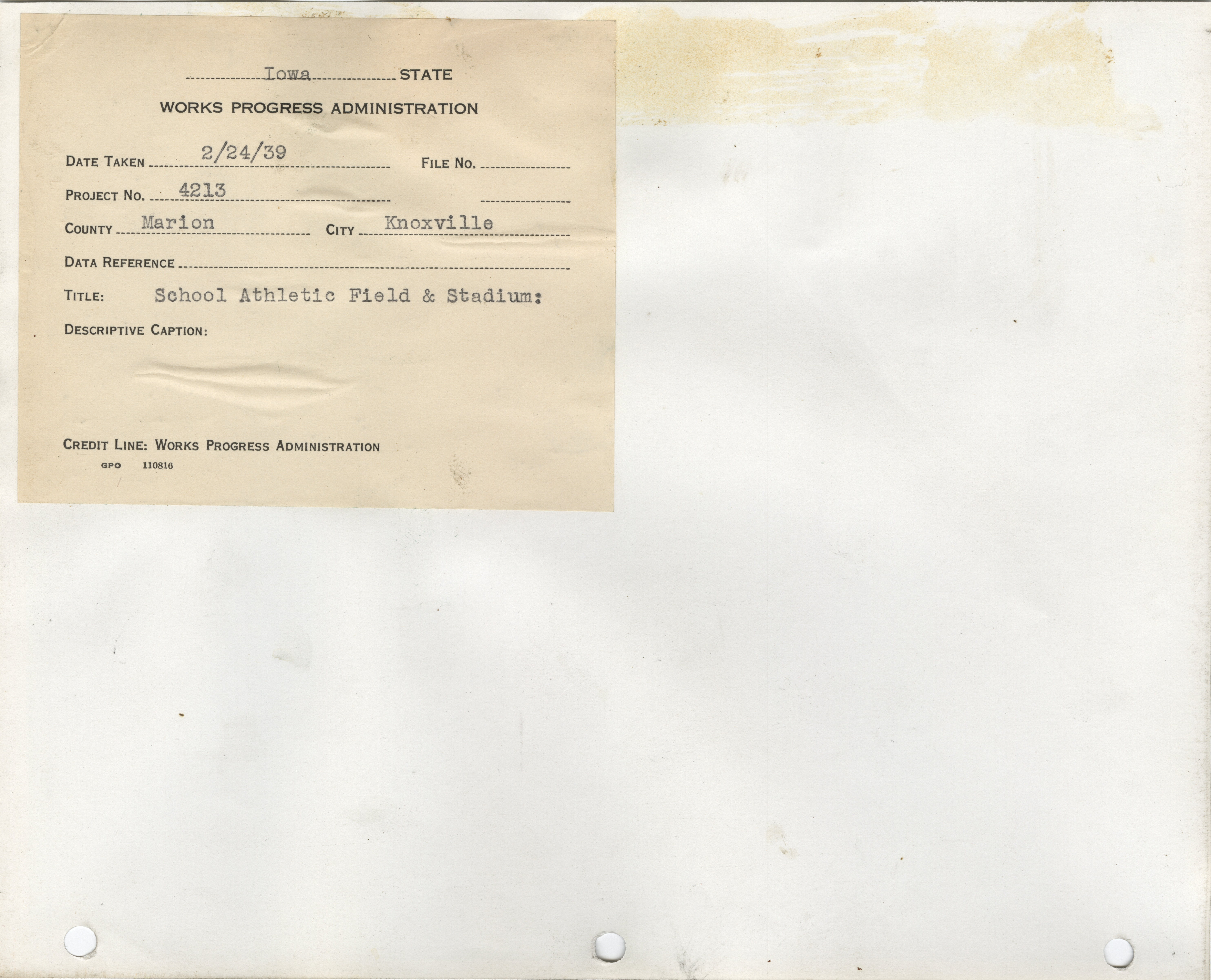 - School Buildings. Marion County. Knoxville. School Athletic Field and Stadium. Project 4213. (4 b/w photographs), 1938-1939