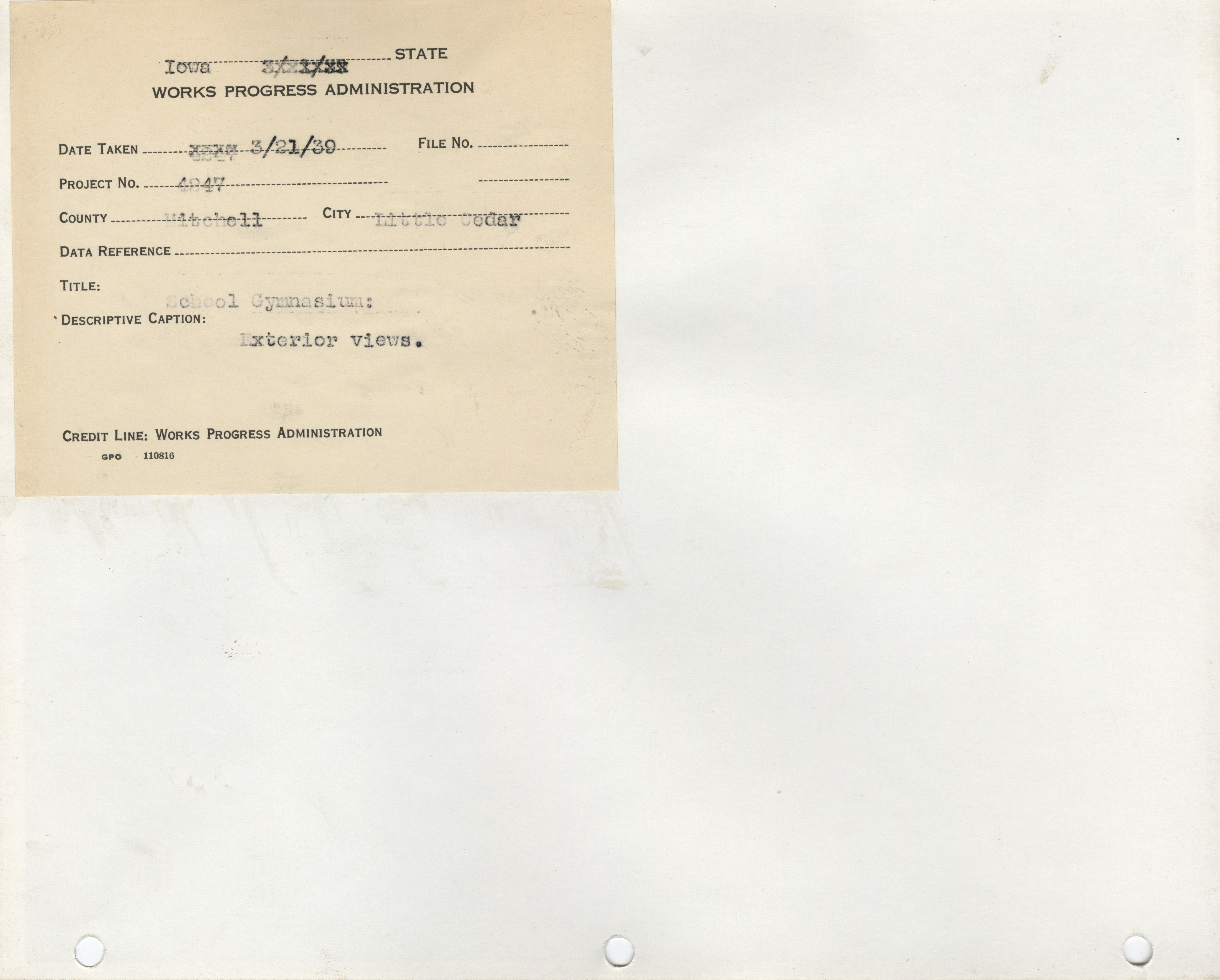 - School Buildings. Mitchell County. Little Cedar. School Gym. Project 4247. (3 b/w photographs), 1939