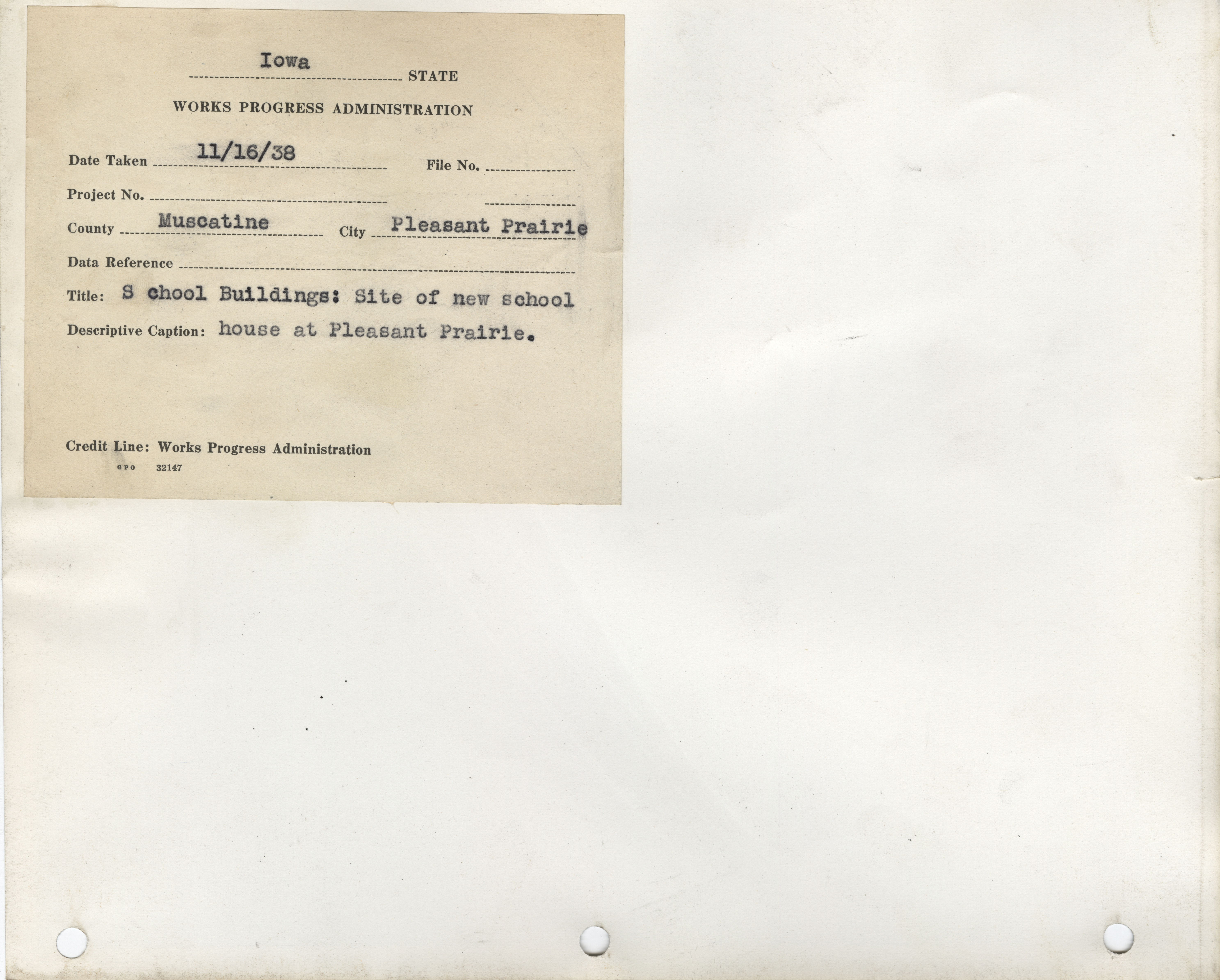 - "Photograph of a school house in Pleasant Prairie", Work Projects Administration (Iowa) Photographs, Iowa State University Library Digital Collections