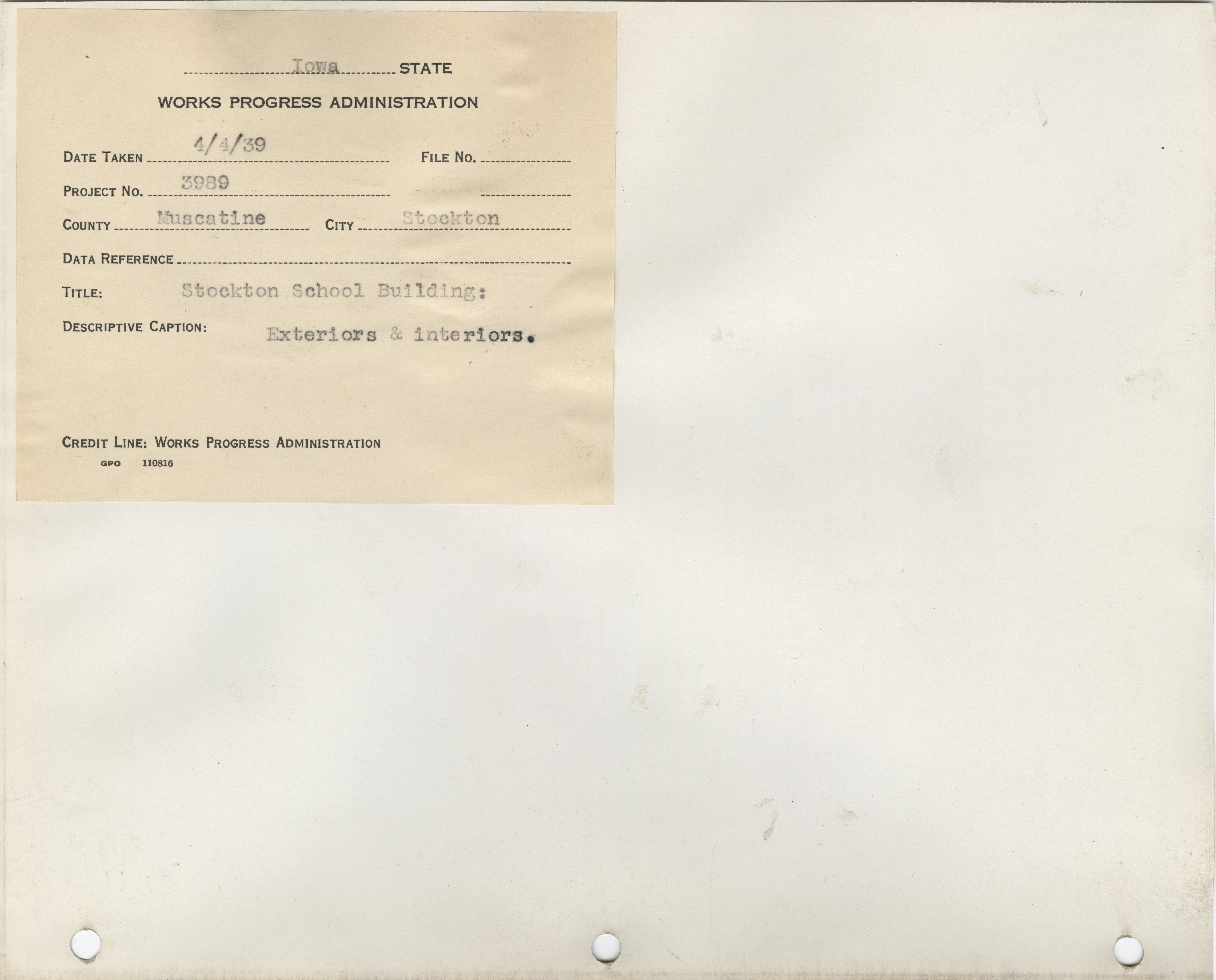 - School Buildings. Muscatine County. Stockton. School Building. Project 3989. (5 b/w photographs), 1939