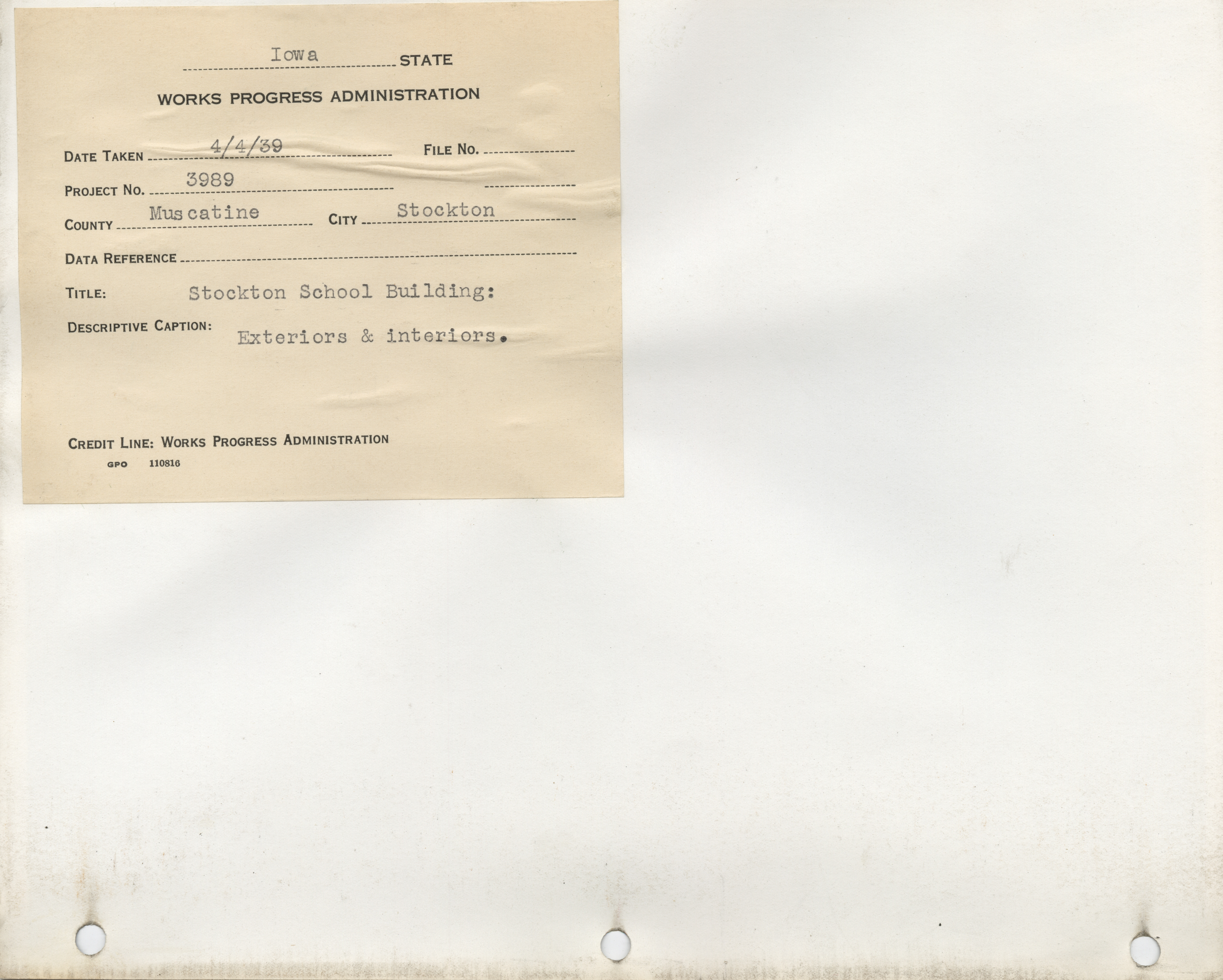 - School Buildings. Muscatine County. Stockton. School Building. Project 3989. (5 b/w photographs), 1939