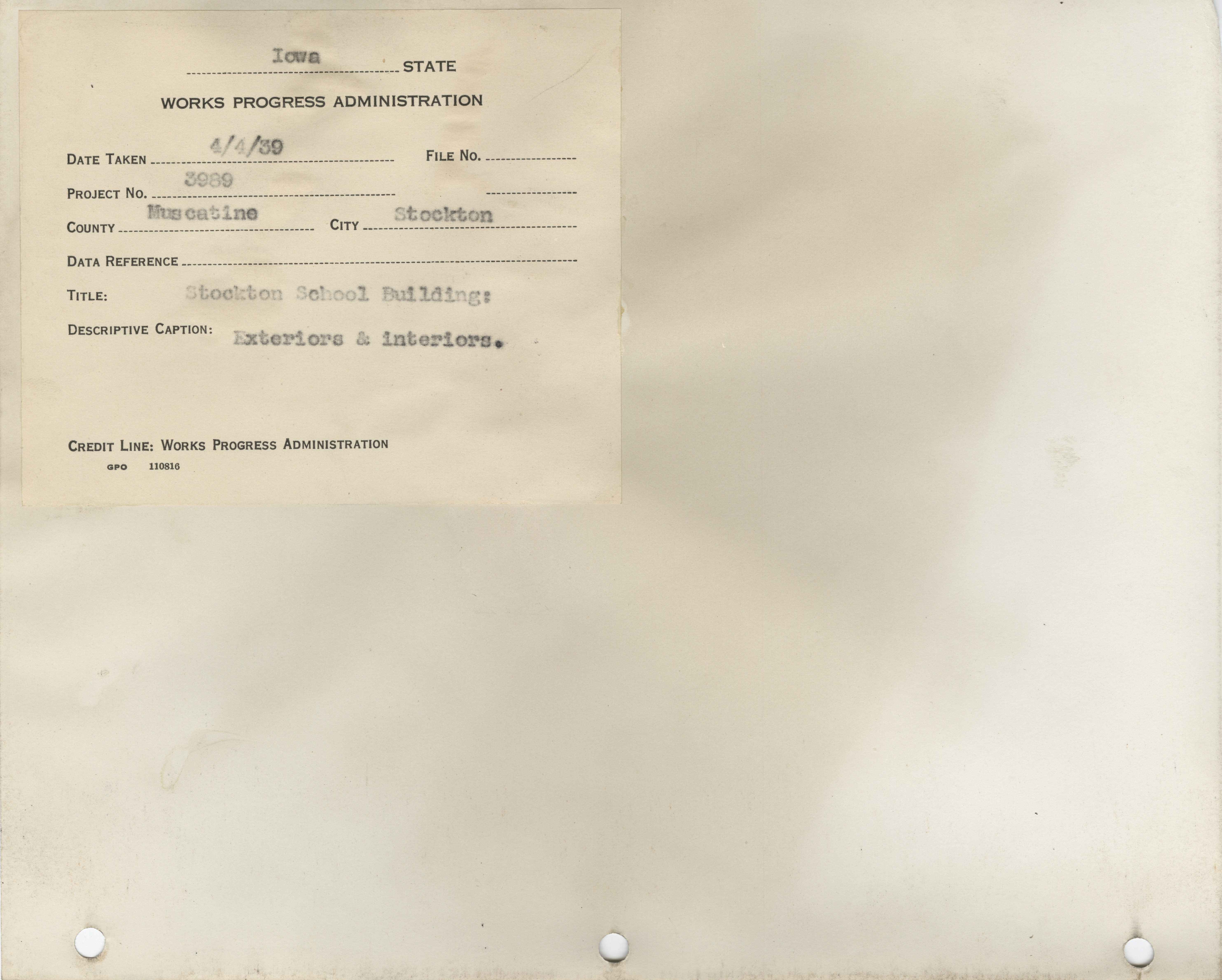 - School Buildings. Muscatine County. Stockton. School Building. Project 3989. (5 b/w photographs), 1939