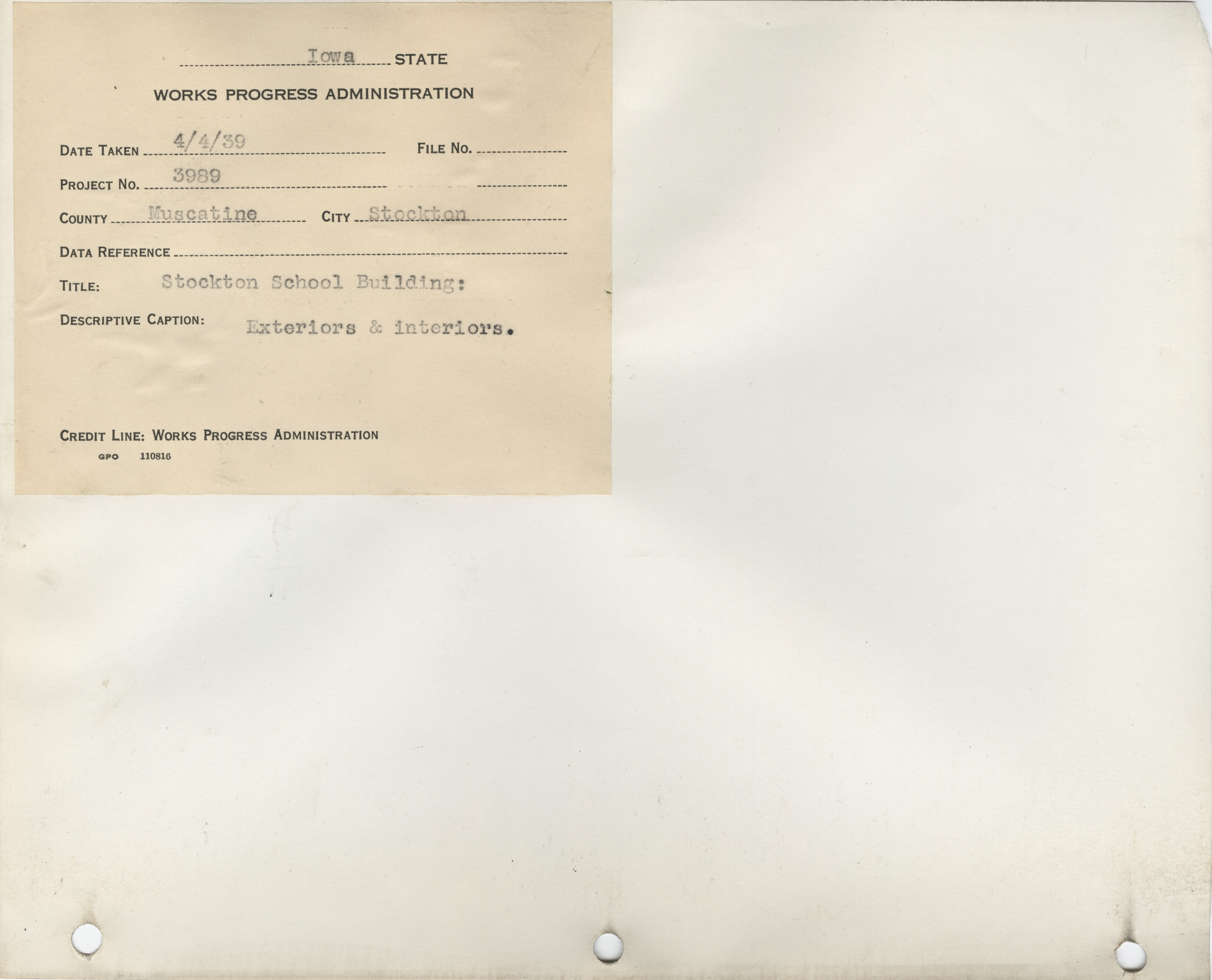 - School Buildings. Muscatine County. Stockton. School Building. Project 3989. (5 b/w photographs), 1939