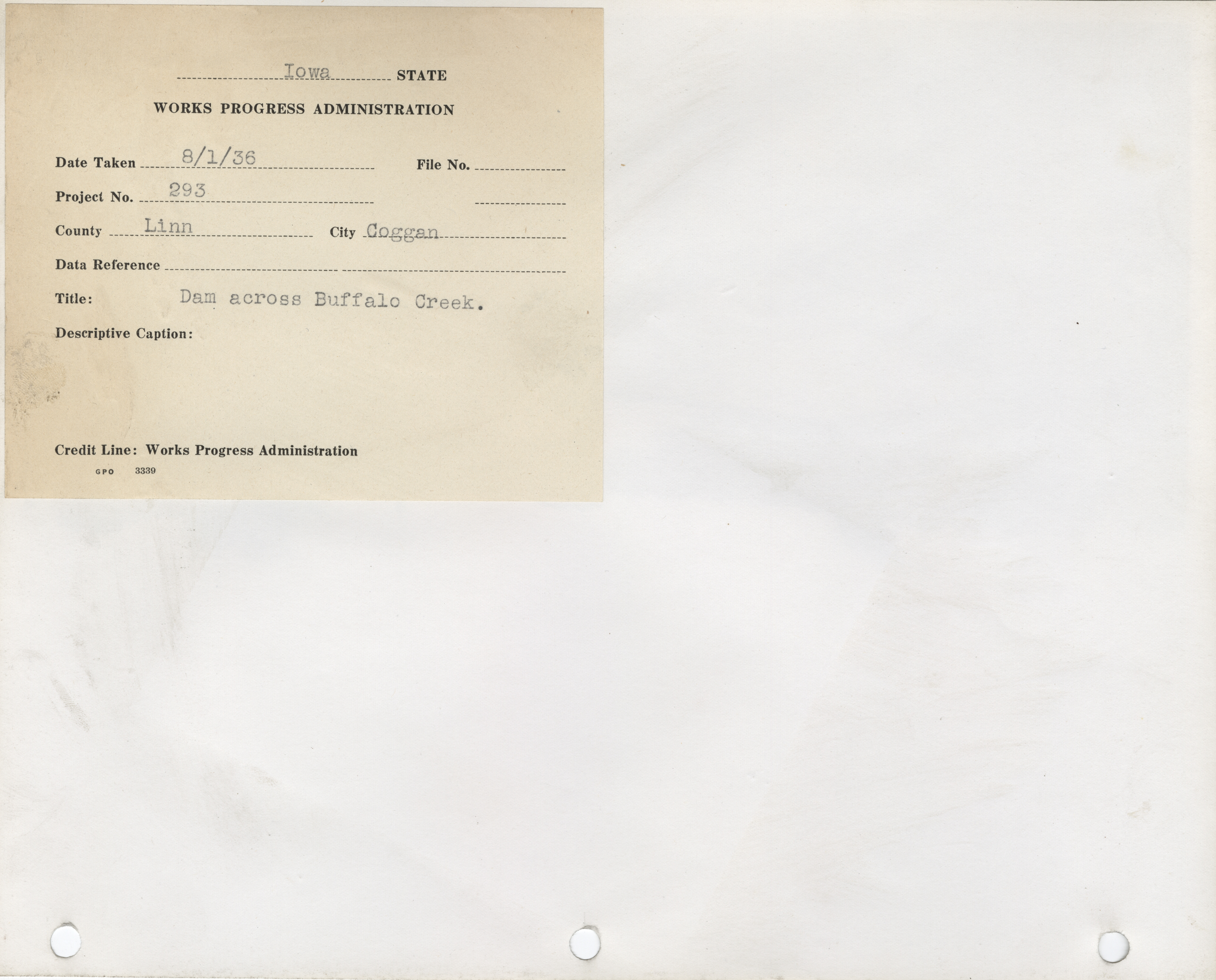 - Sanitation and Water Supply. Linn County. Coggon. Dam Across Buffalo Creek. Project 293. (1 b/w photograph), 1936