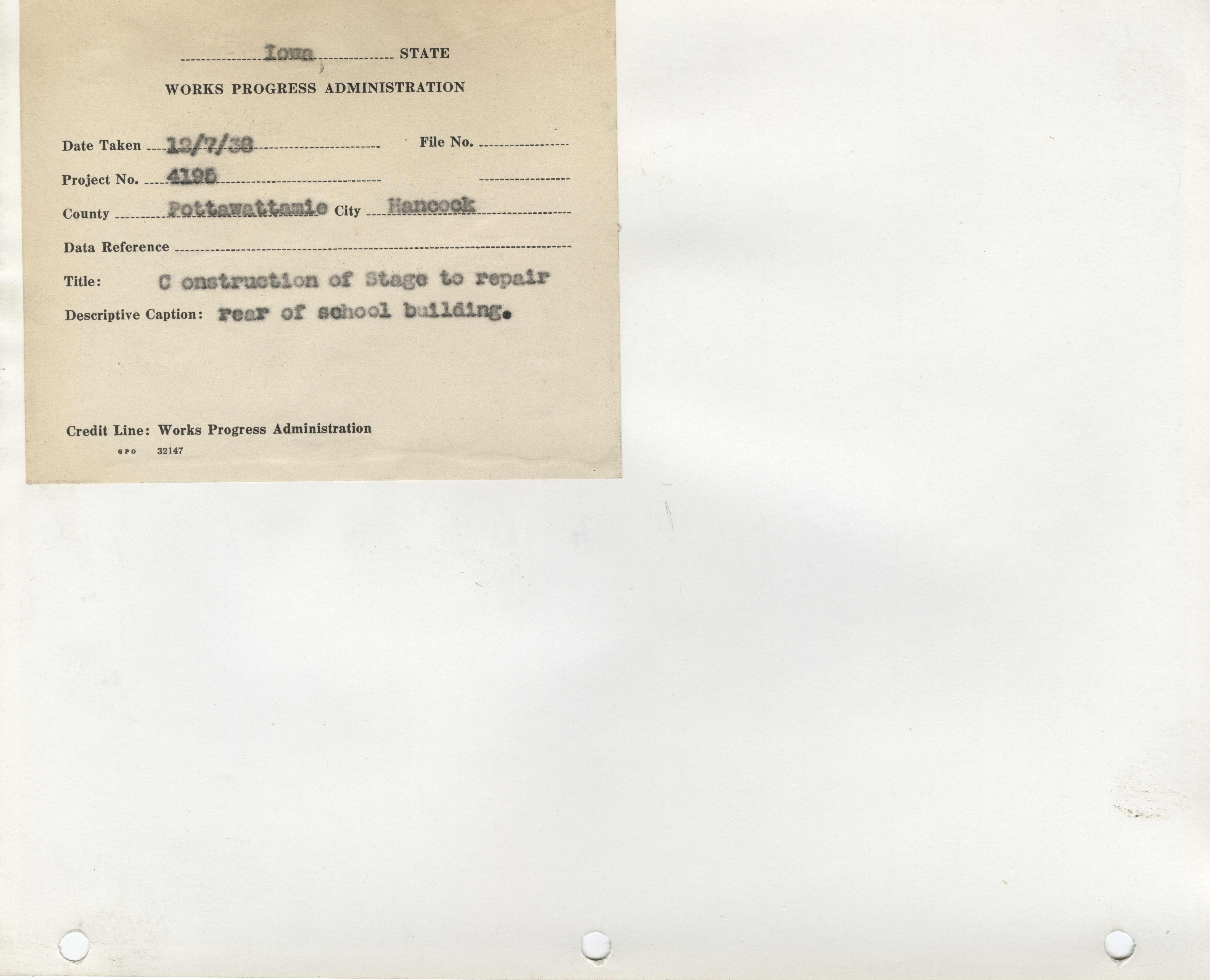 - "Photograph of school building repair in Hancock", Work Projects Administration (Iowa) Photographs, Iowa State University Library Digital Collections
