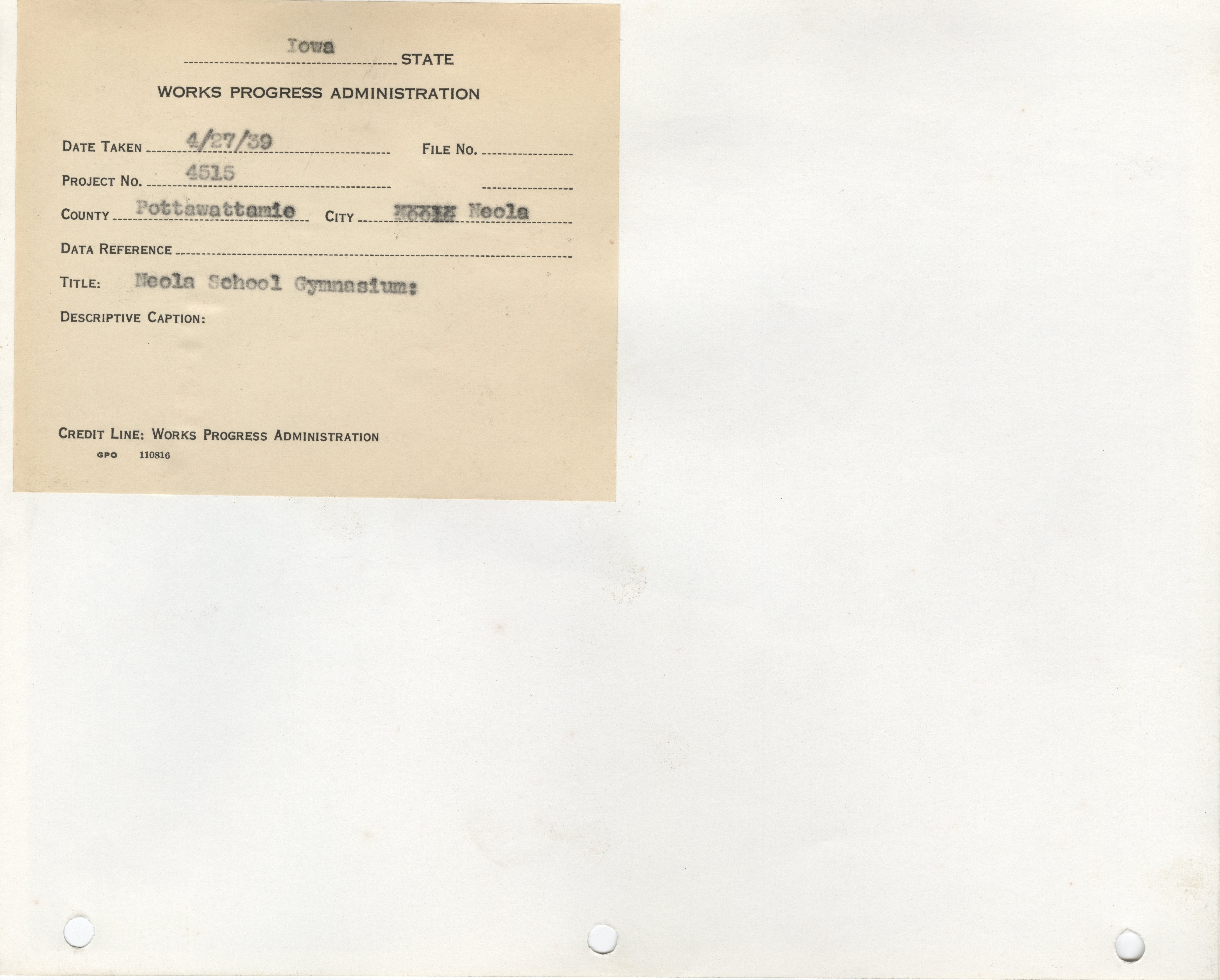 - "Photograph of school gymnasium construction in Neola", Work Projects Administration (Iowa) Photographs, Iowa State University Library Digital Collections