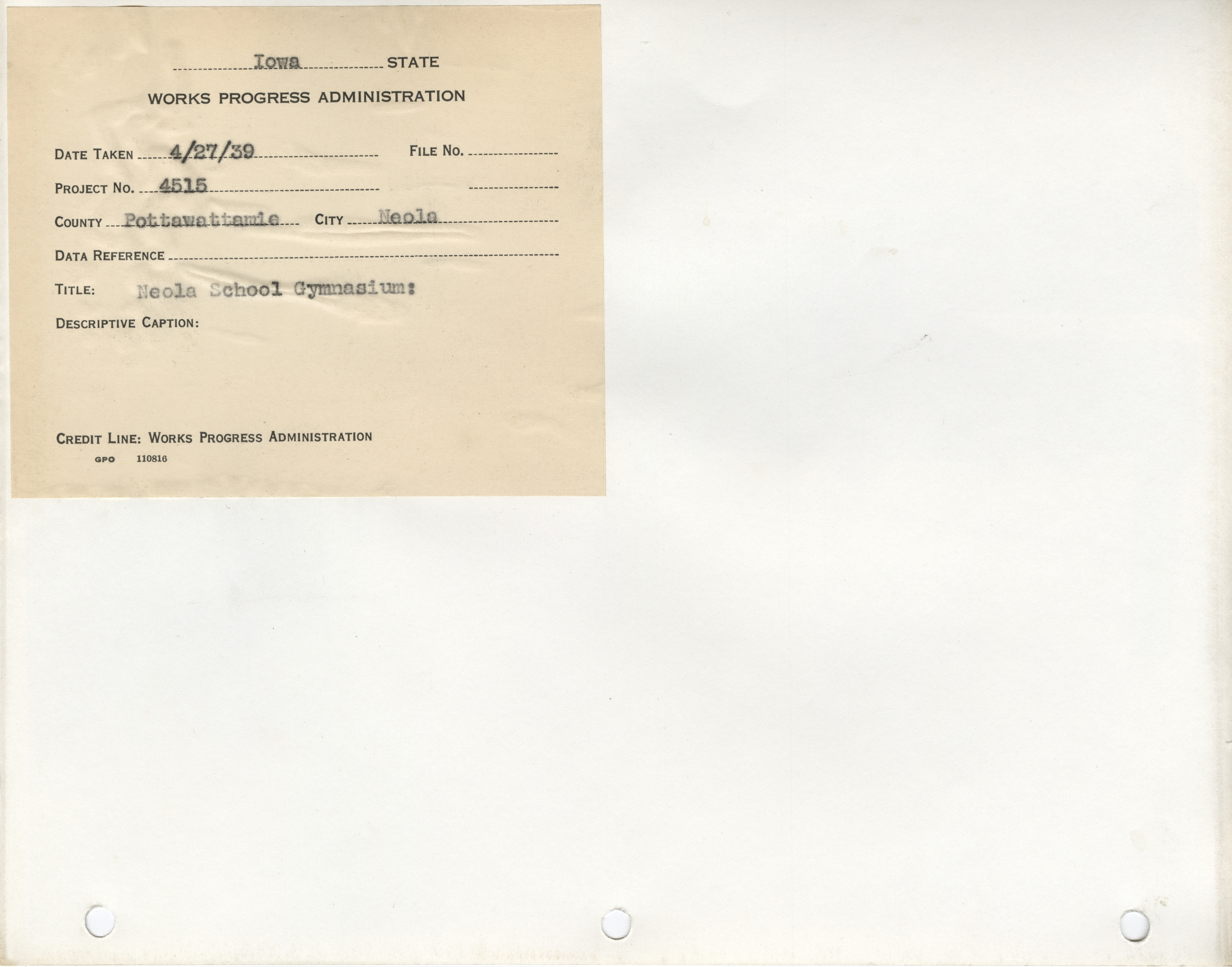 - "Photograph of school gymnasium construction in Neola", Work Projects Administration (Iowa) Photographs, Iowa State University Library Digital Collections