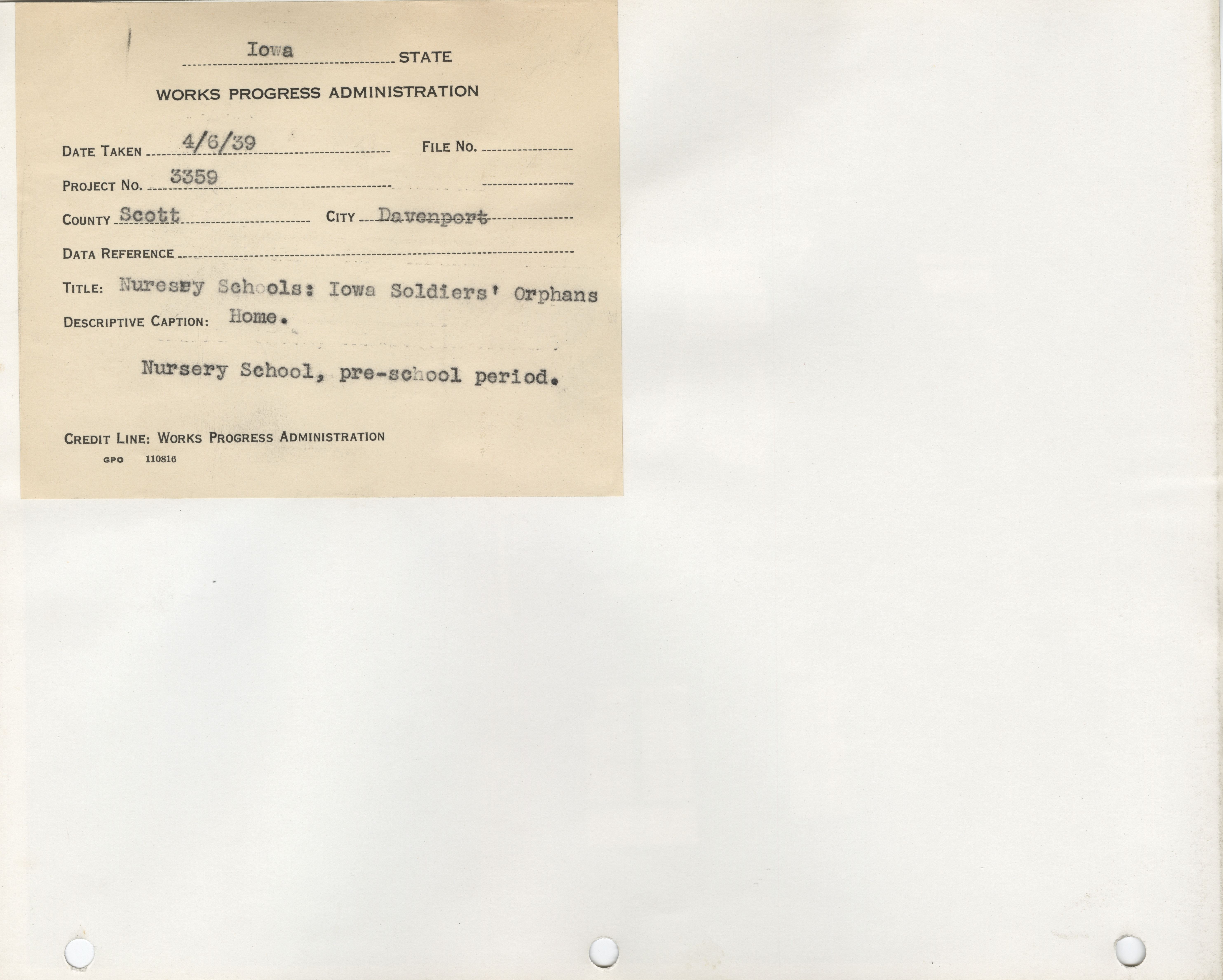 - School Buildings. Scott County. Davenport. Nursery School, Iowa Soldiers' Orphans Home. Project 3359. (1 b/w photograph), 1939