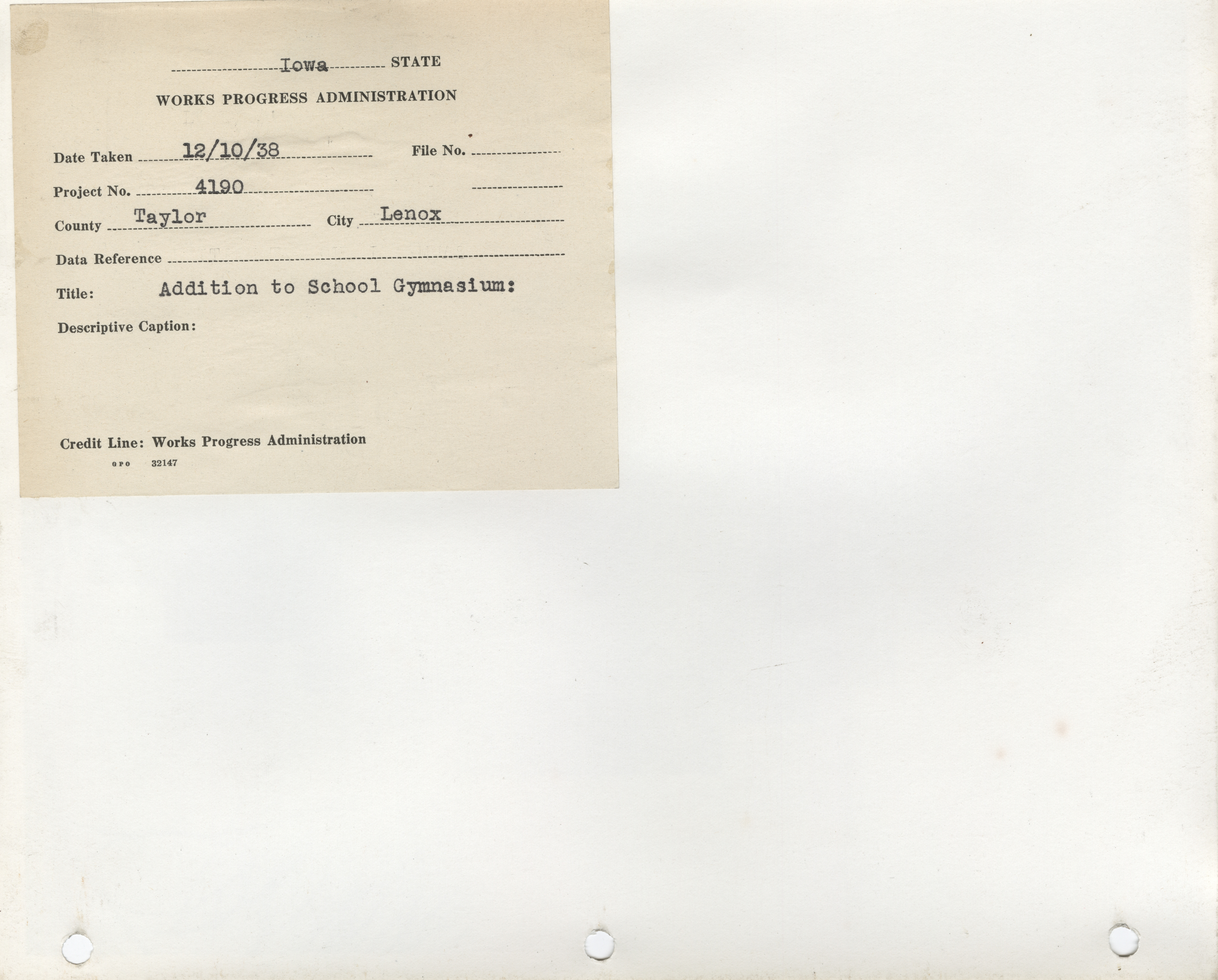 - "Photograph of a school gymnasium addition in Lenox", Work Projects Administration (Iowa) Photographs, Iowa State University Library Digital Collections