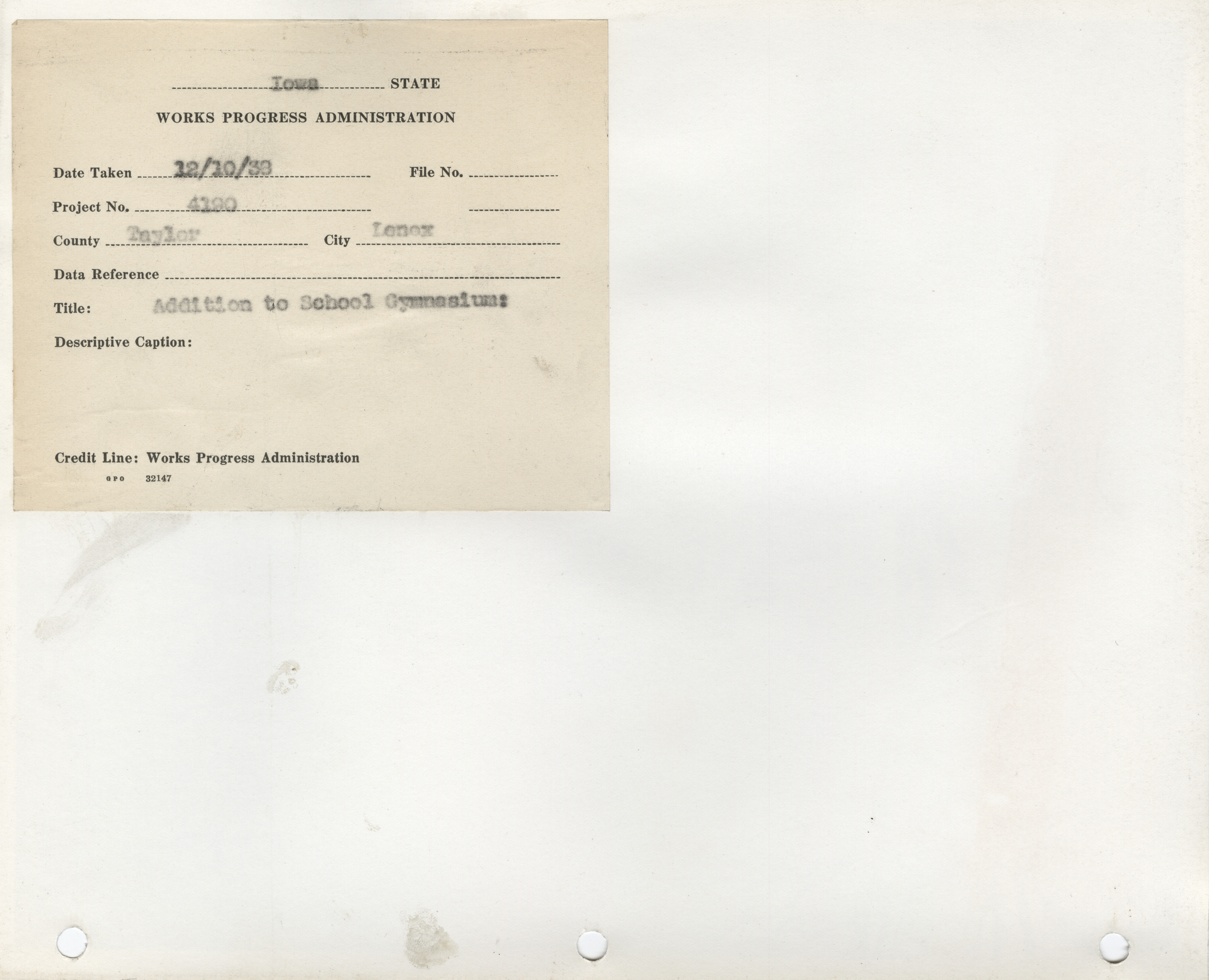 - School Buildings. Taylor County. Lenox. School Gym Addition. Project 4190. (2 b/w photographs), 1938