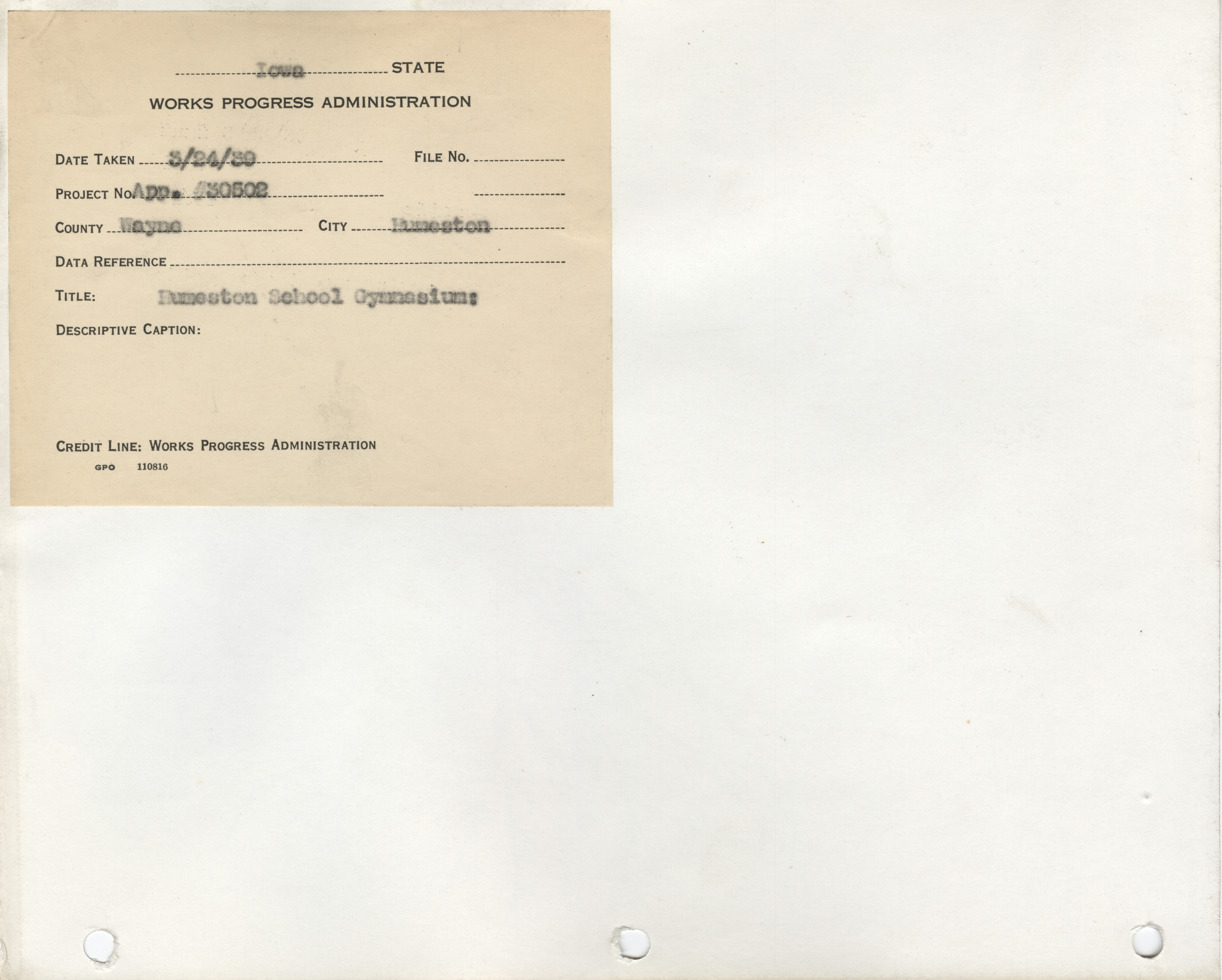 - "Photograph of a school gymnasium in Humeston", Work Projects Administration (Iowa) Photographs, Iowa State University Library Digital Collections