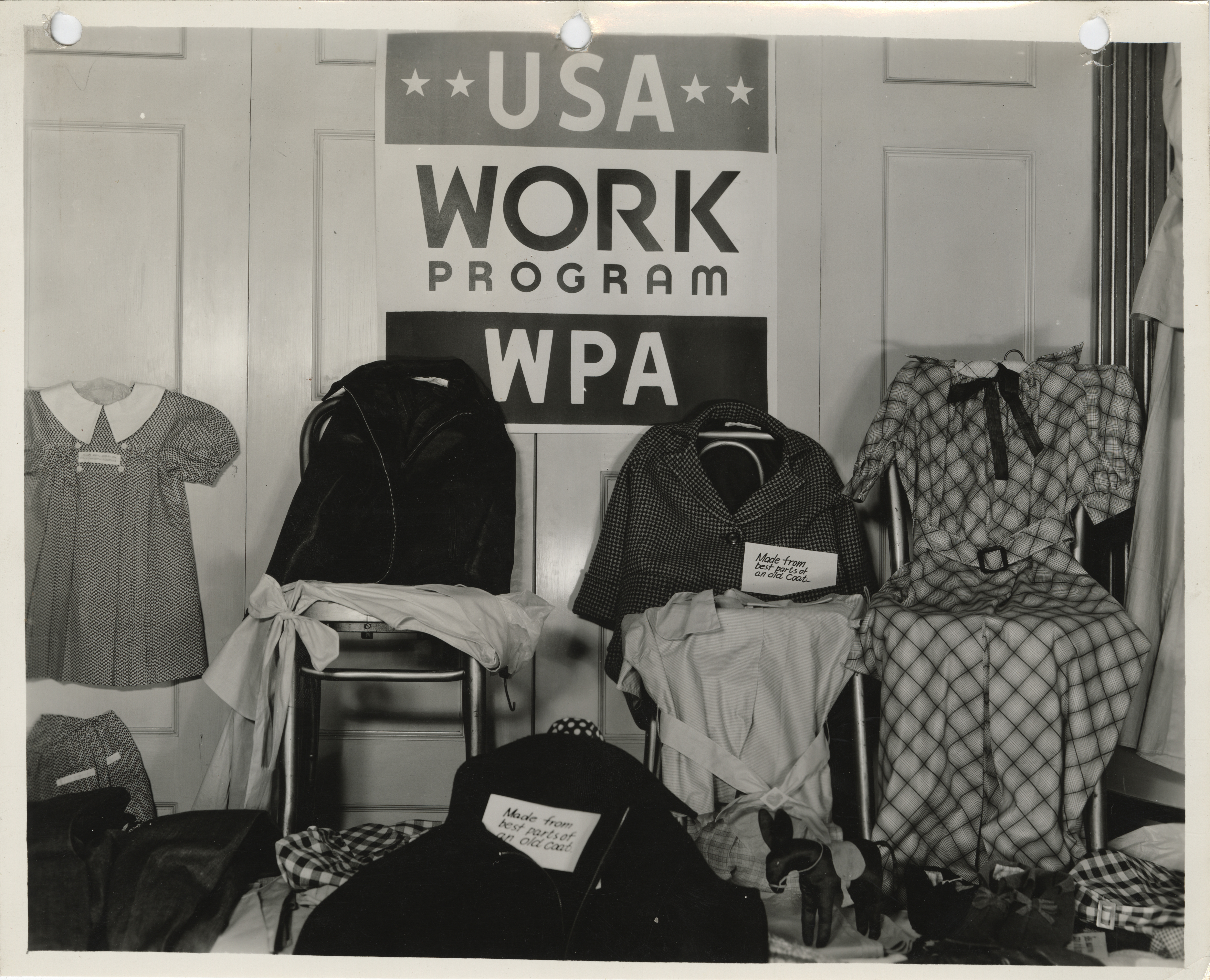 - "Photograph of apparel displayed at the sewing room conference and exhibit in Waterloo", Work Projects Administration (Iowa) Photographs, Iowa State University Library Digital Collections