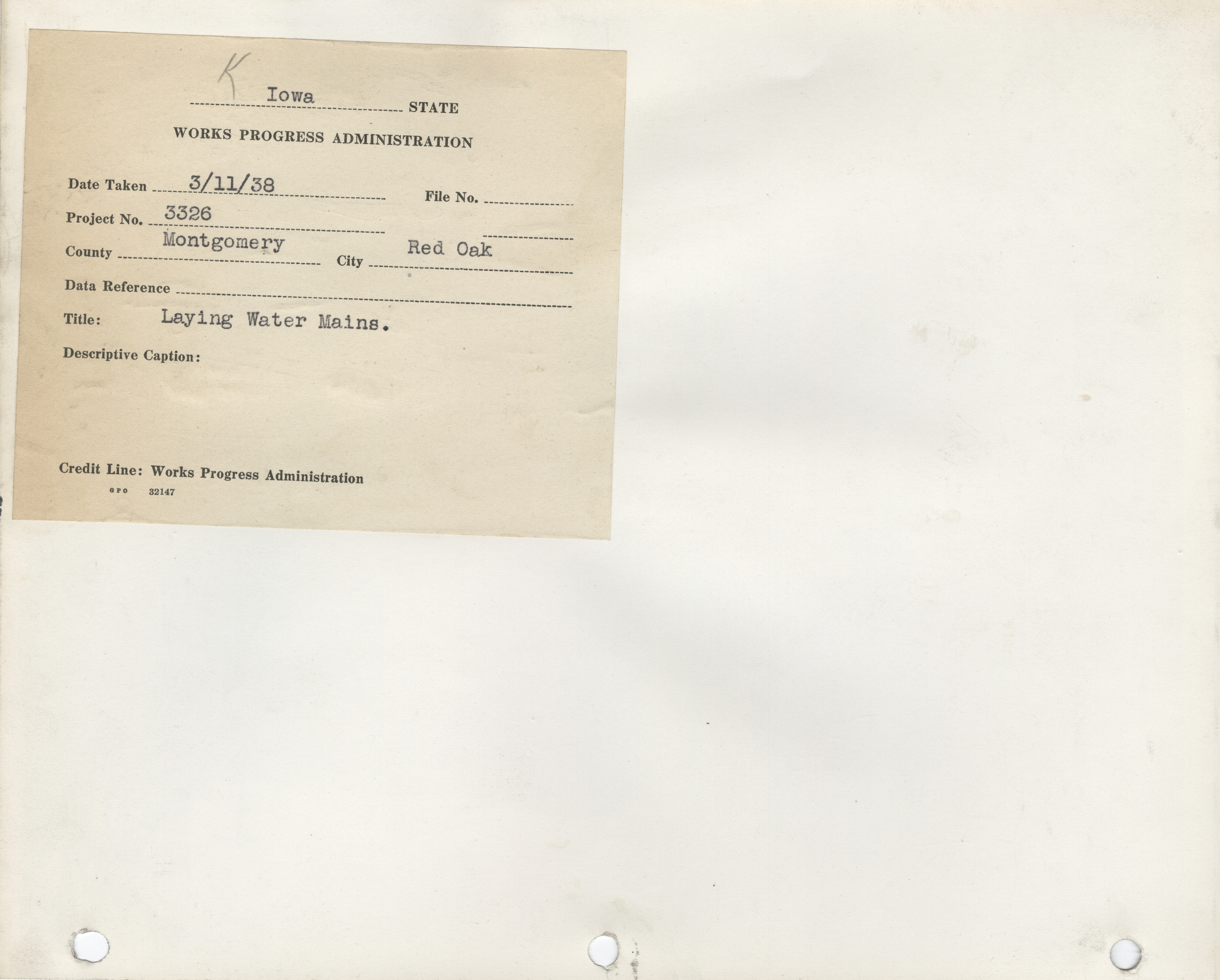 - "Photograph of people laying water mains in Red Oak", Work Projects Administration (Iowa) Photographs, Iowa State University Library Digital Collections