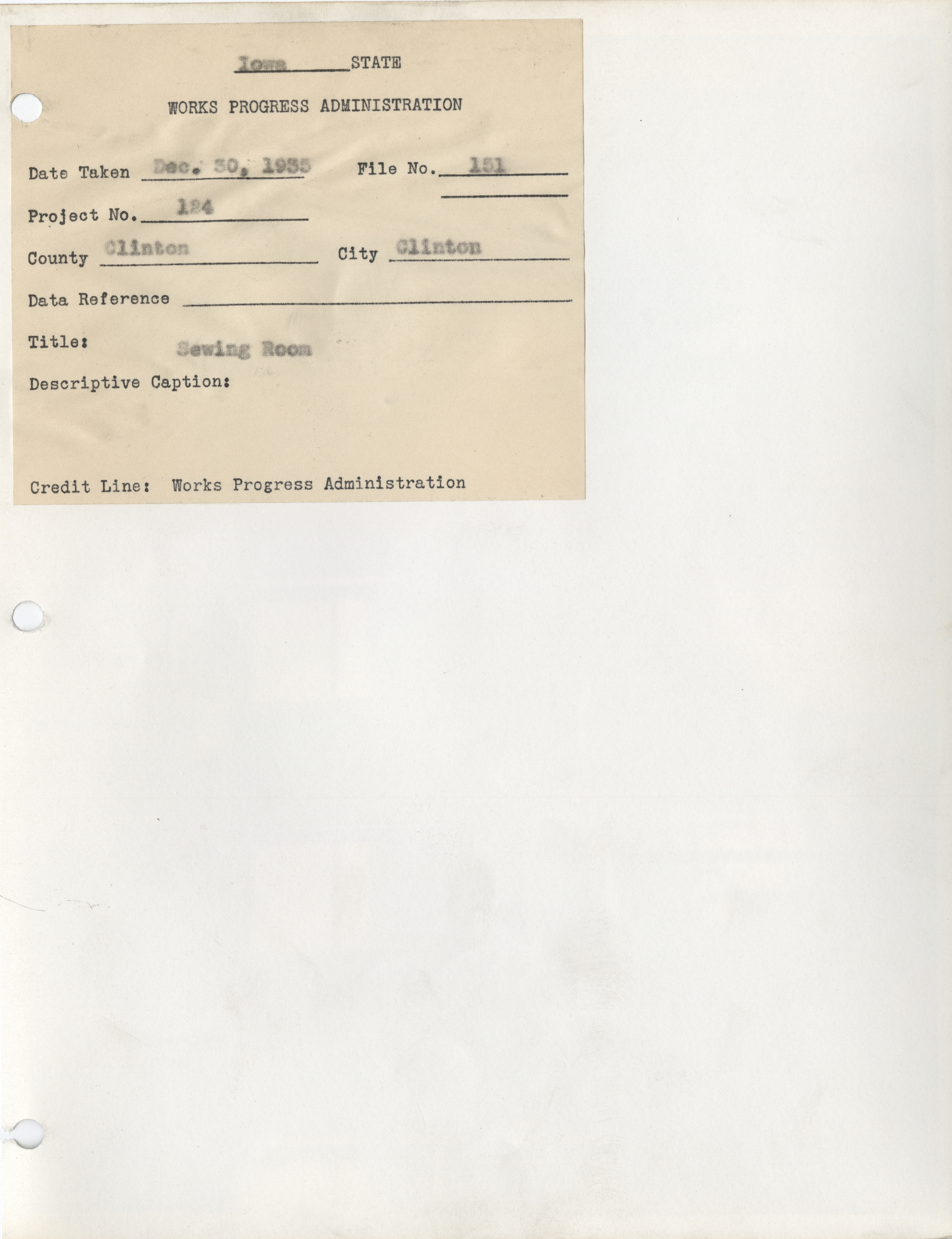 - Sewing Rooms. Clinton County. Clinton. Sewing Room. Project 124. (1 b/w photograph), 1935