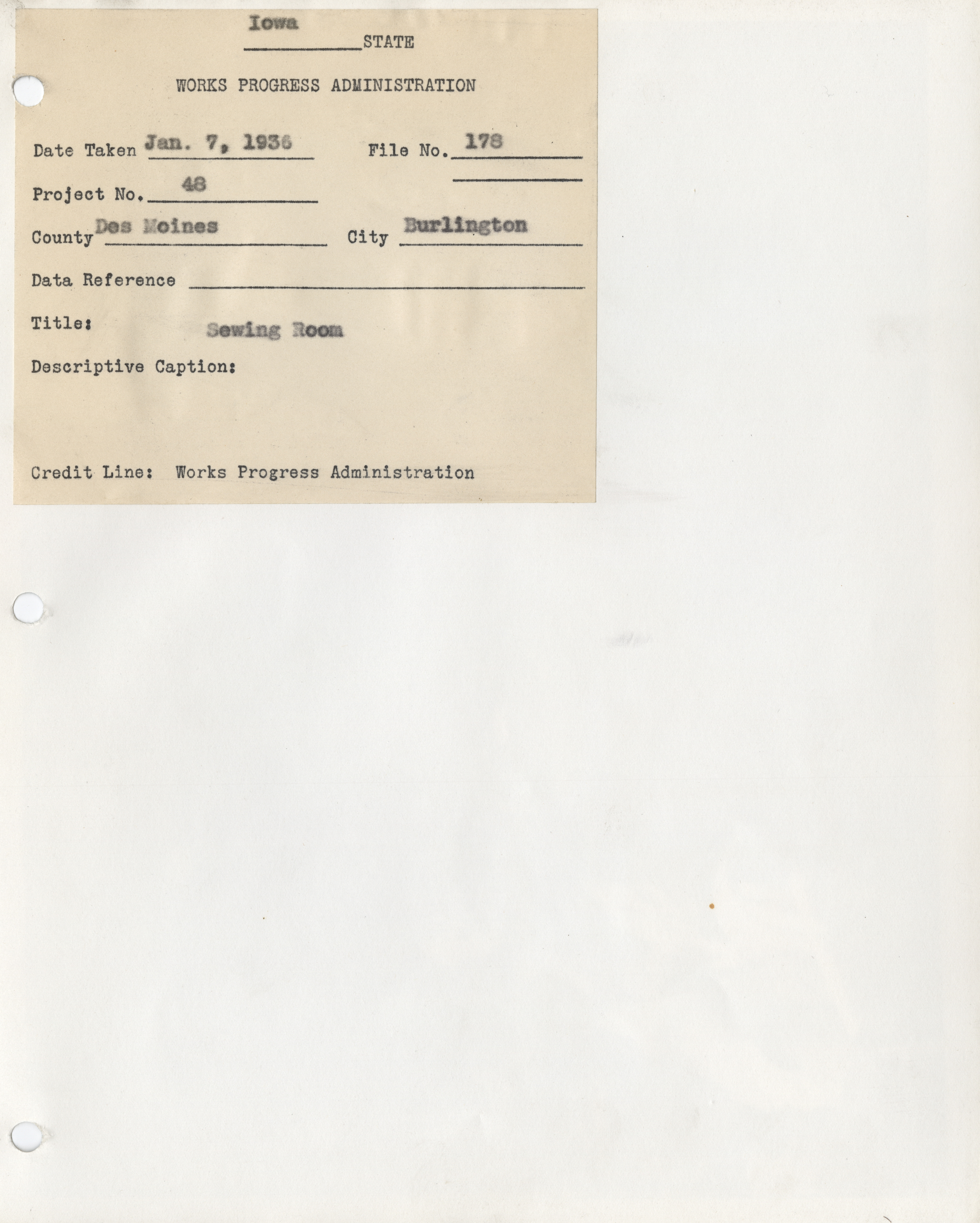 - Sewing Rooms. Des Moines County. Burlington. Sewing Room. Project 48. (1 b/w photograph), 1936