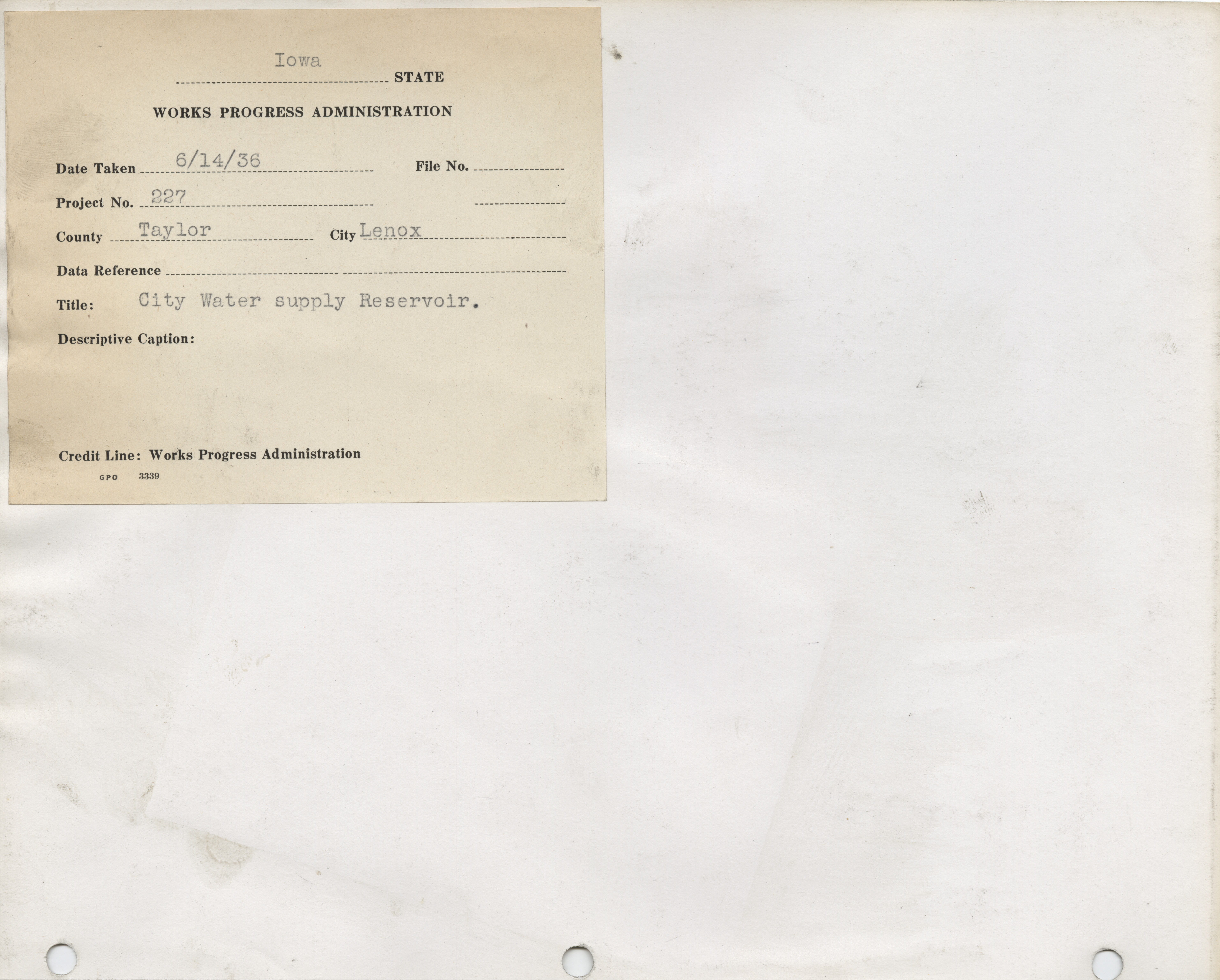 - "Photograph of a reservoir in Lenox", Work Projects Administration (Iowa) Photographs, Iowa State University Library Digital Collections