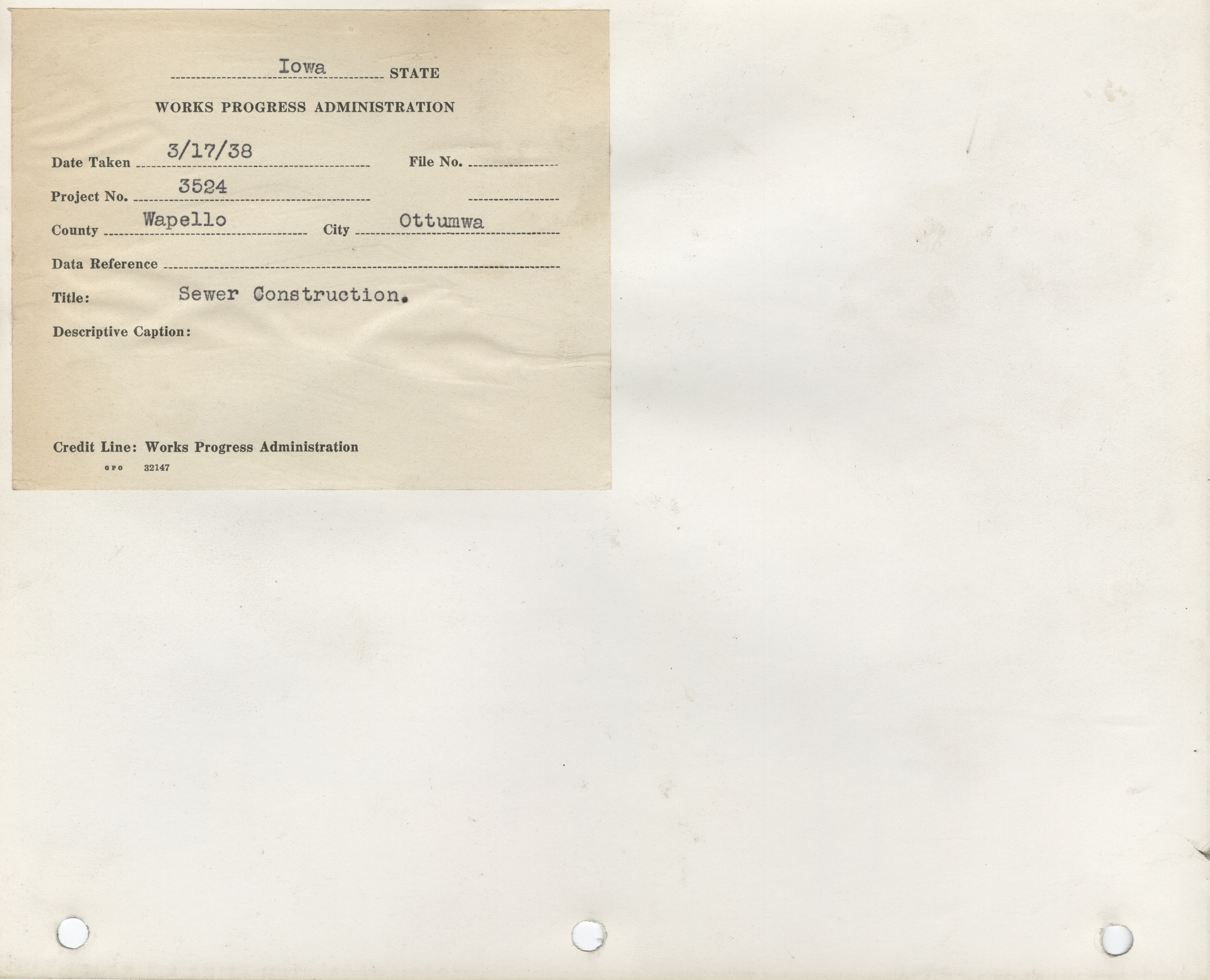 - Sanitation and Water Supply. Wapello County. Ottumwa. Sewer. Project 3524. (1 b/w photograph), 1938